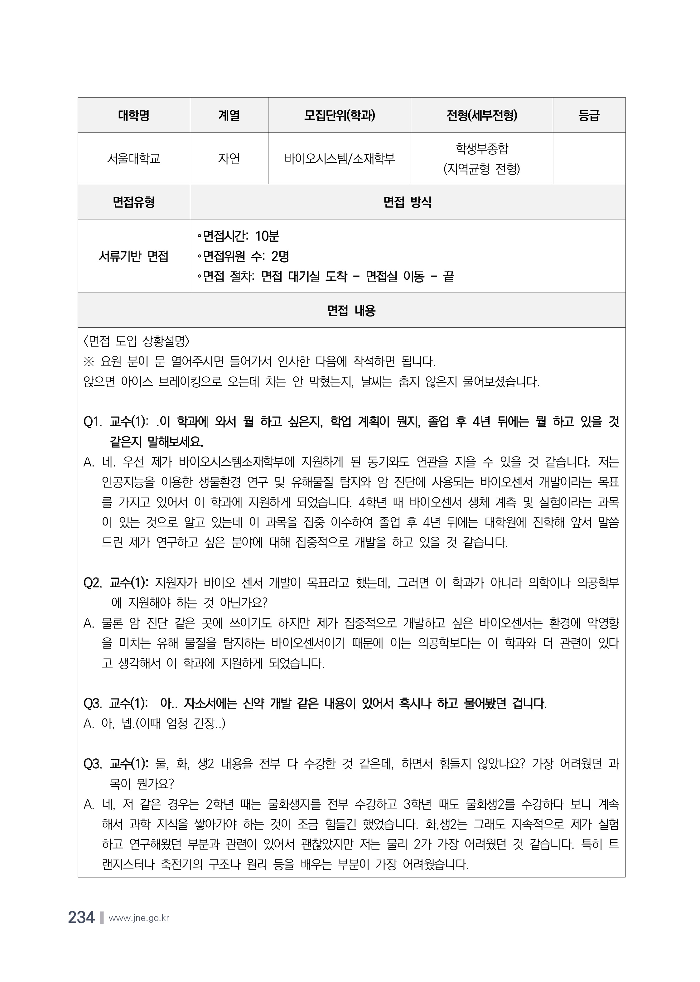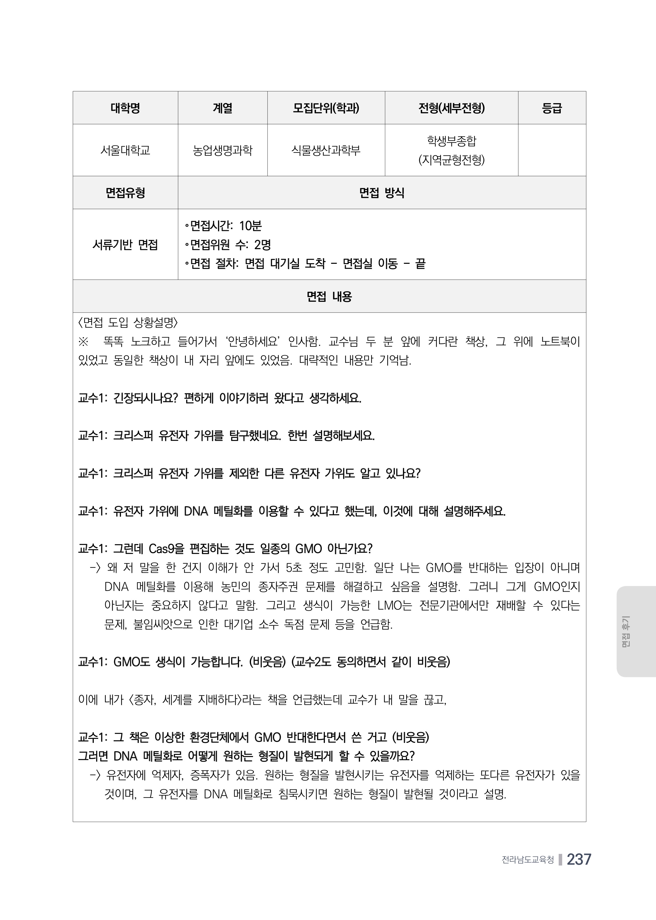 2023학년도 서울대학교 농업생명과학대학 면접 후기14 - 바이오시스템소재학부