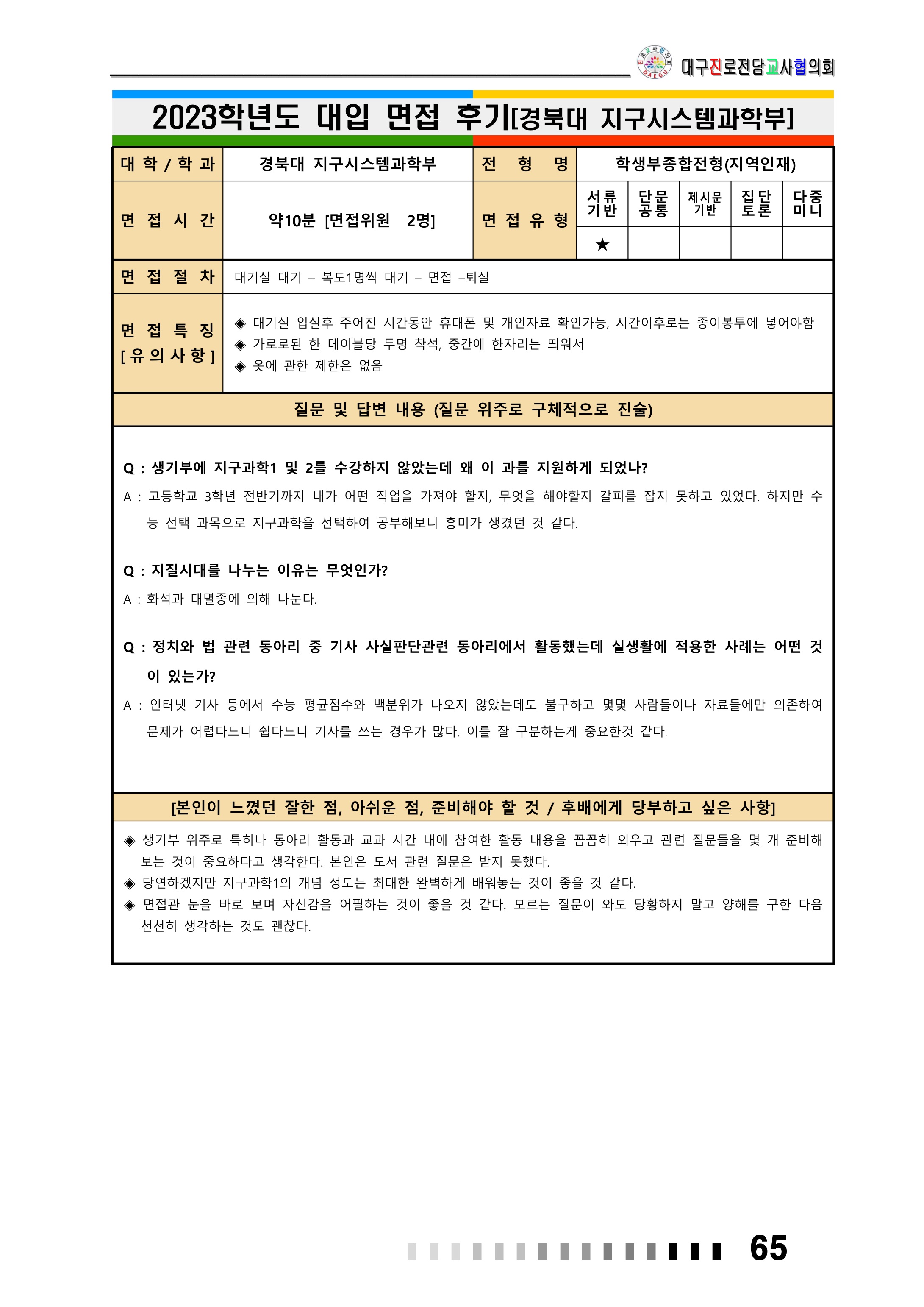 2023학년도 경북대학교 면접 후기34 - 지구시스템과학부 2023학년도 경북대학교 면접 후기35 - 지구시스템과학부