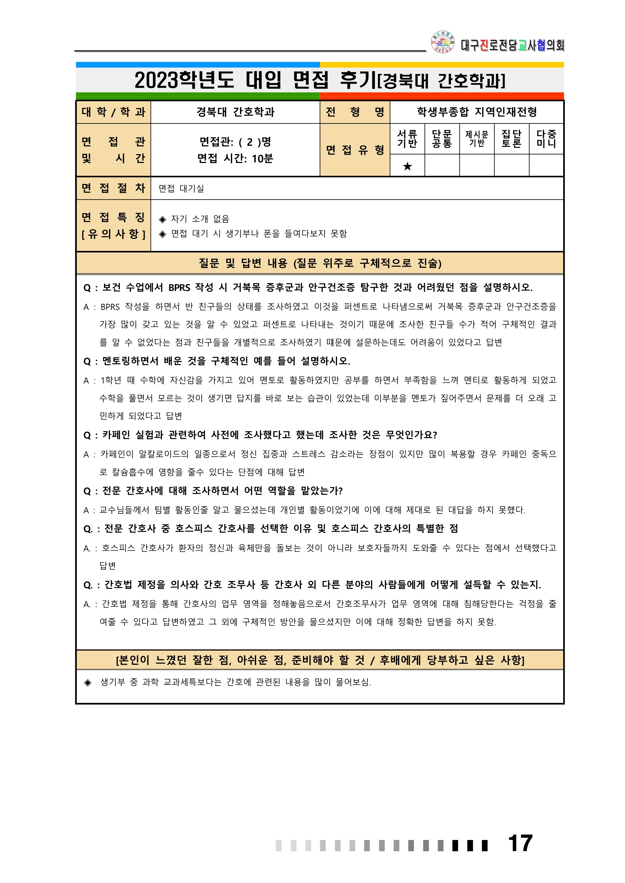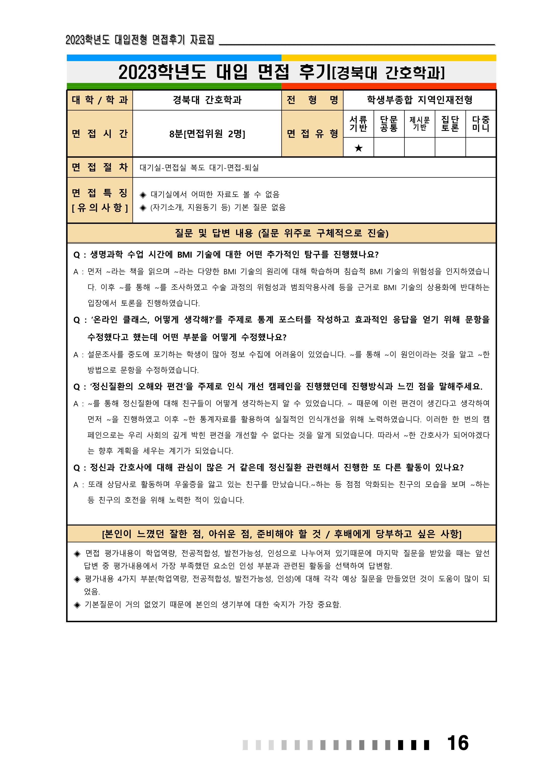 2023학년도 경북대학교 면접 후기1 - 간호학과 2023학년도 경북대학교 면접 후기2 - 간호학과