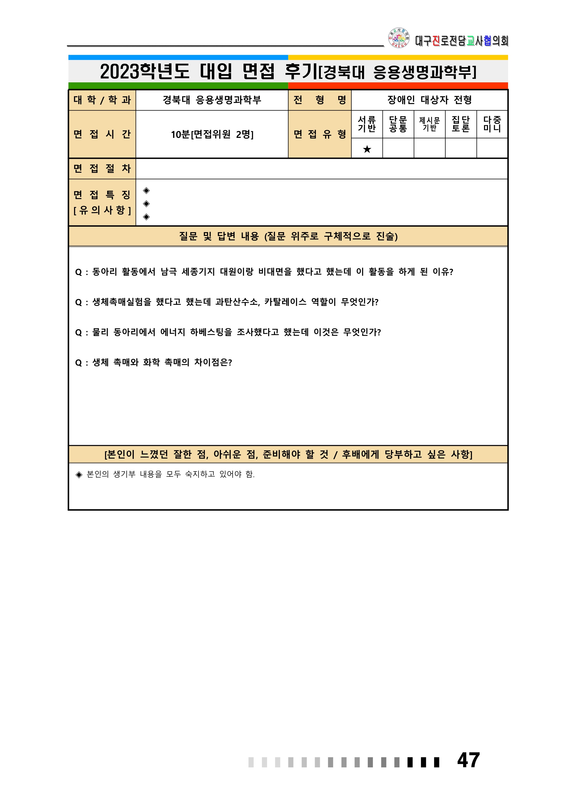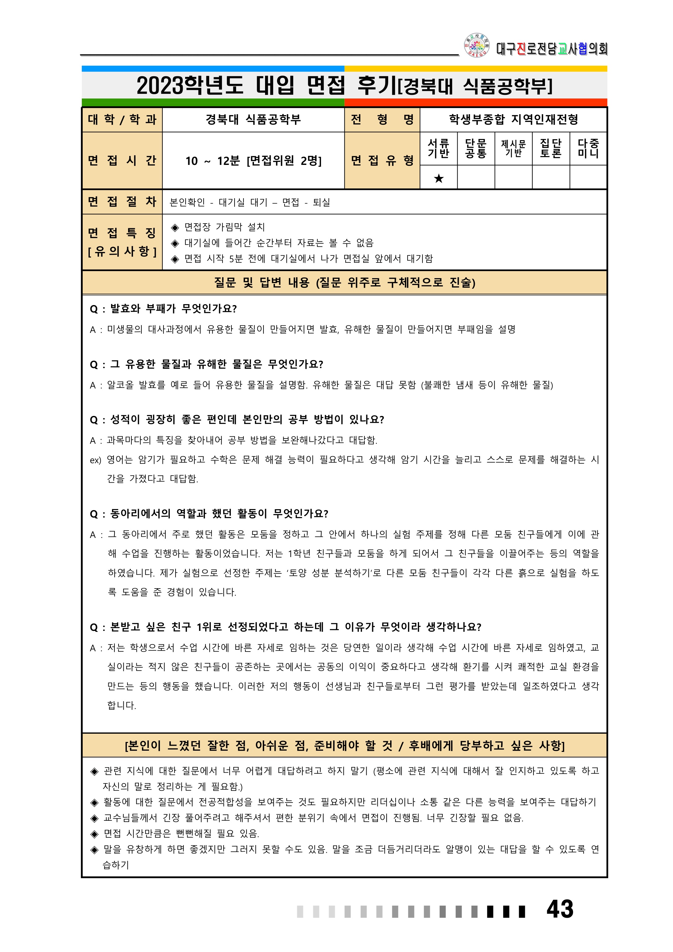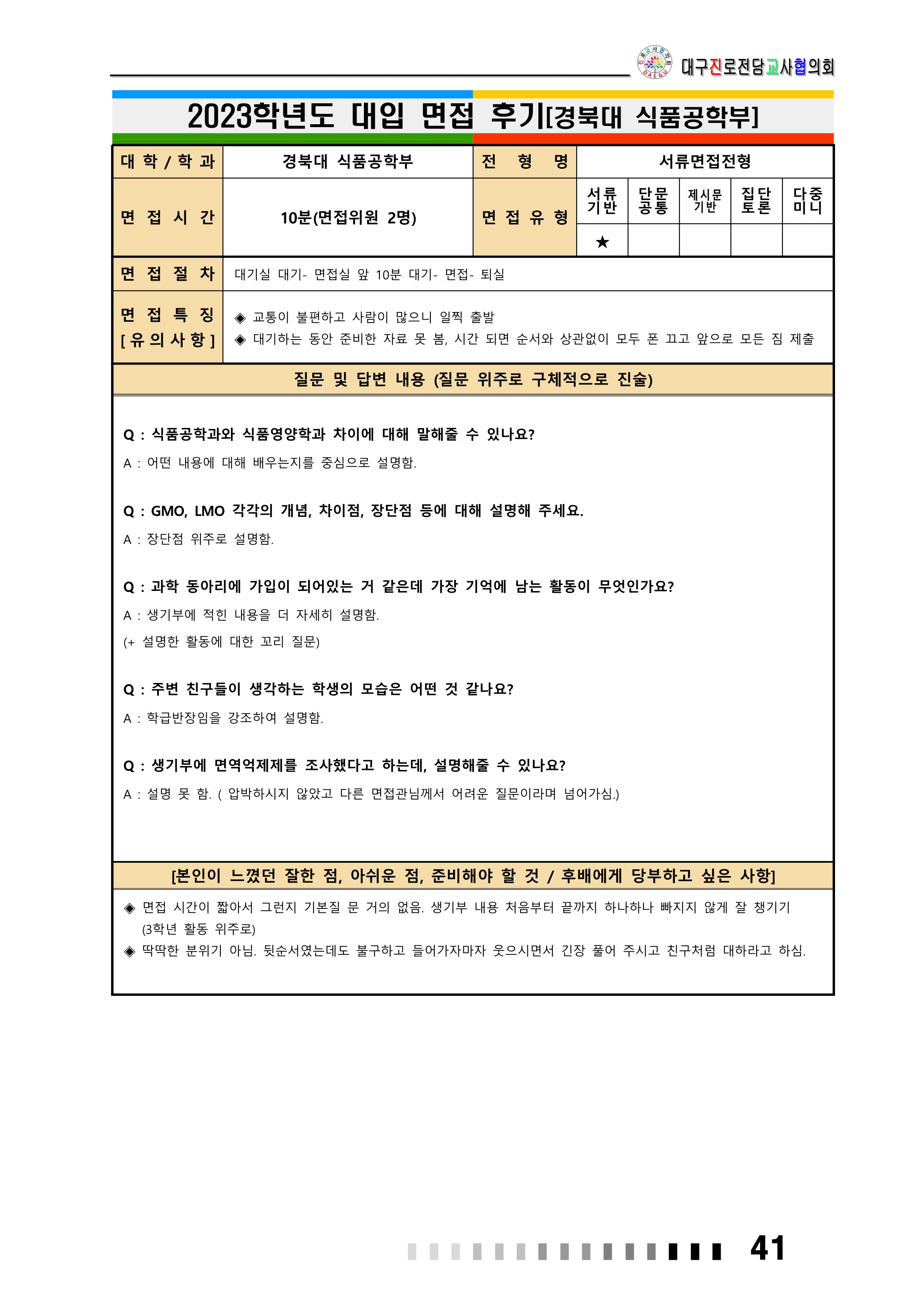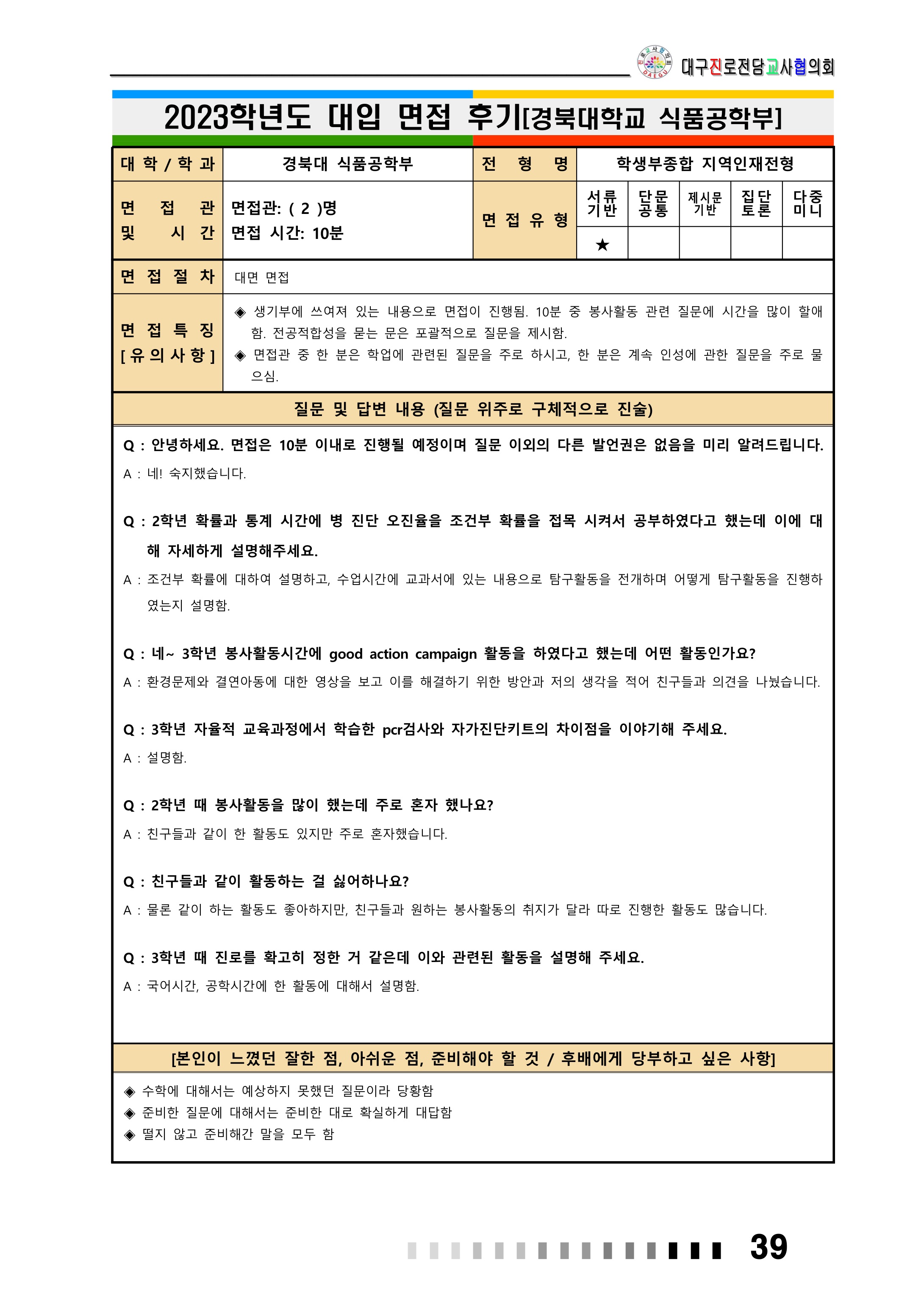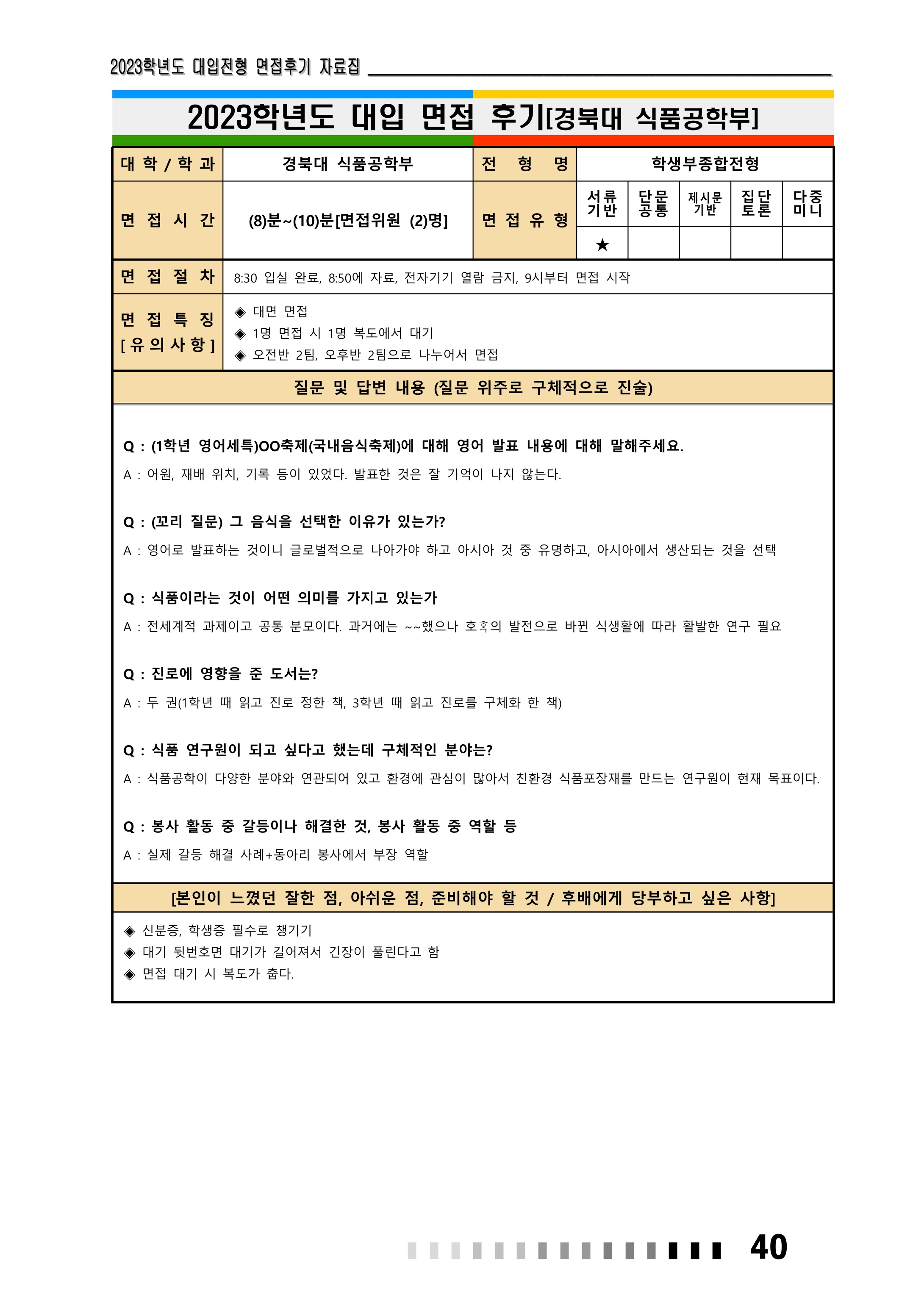 2023학년도 경북대학교 면접 후기23 - 식품공학부 2023학년도 경북대학교 면접 후기24 - 식품공학부