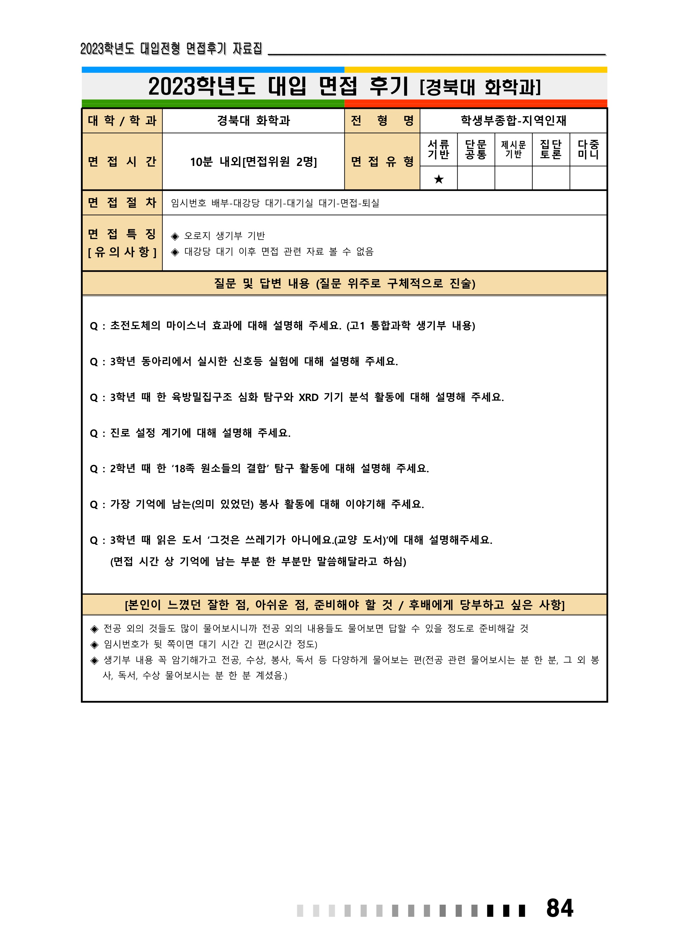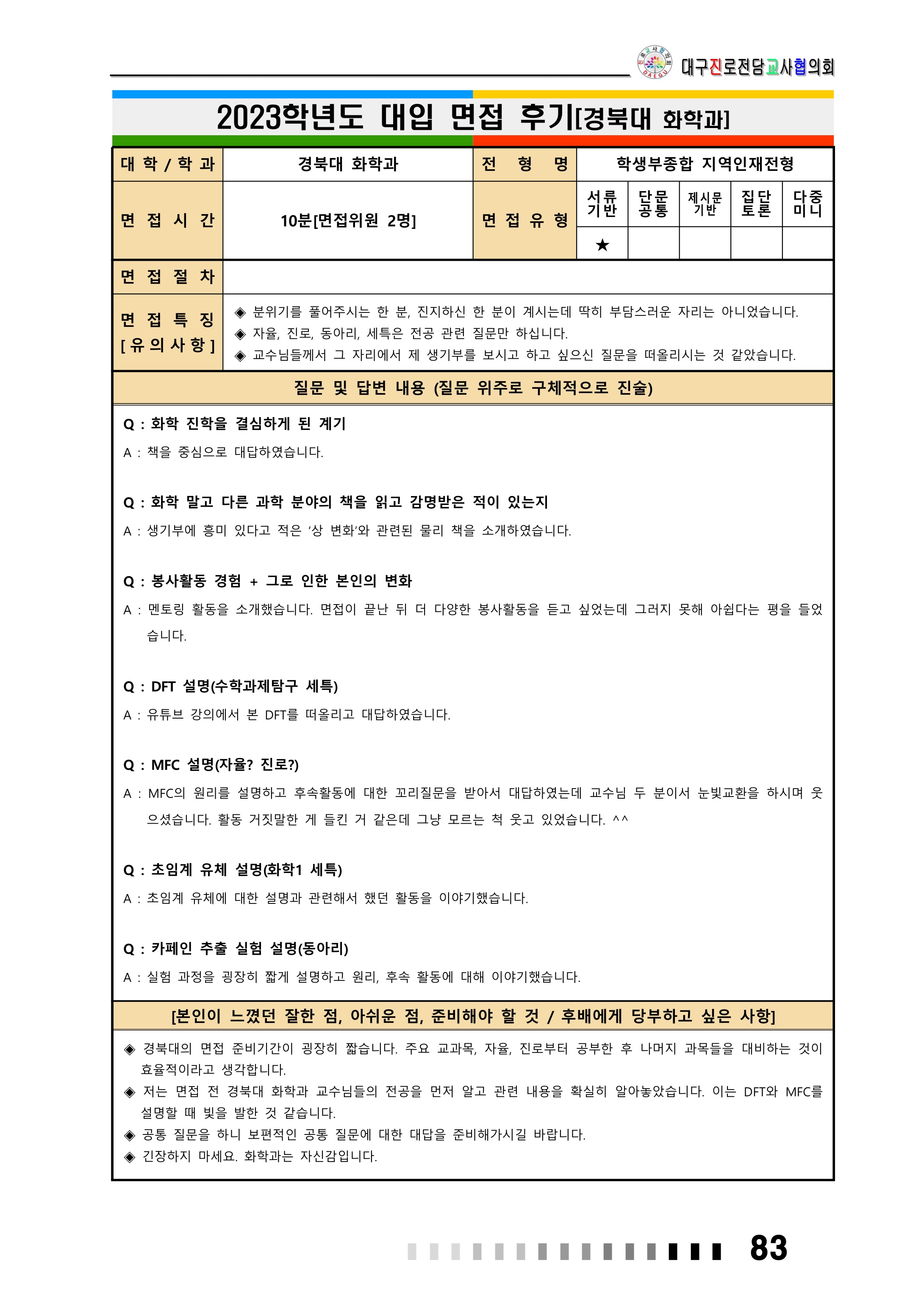 2023학년도 경북대학교 면접 후기41 - 화학공학과 2023학년도 경북대학교 면접 후기42 - 화학과