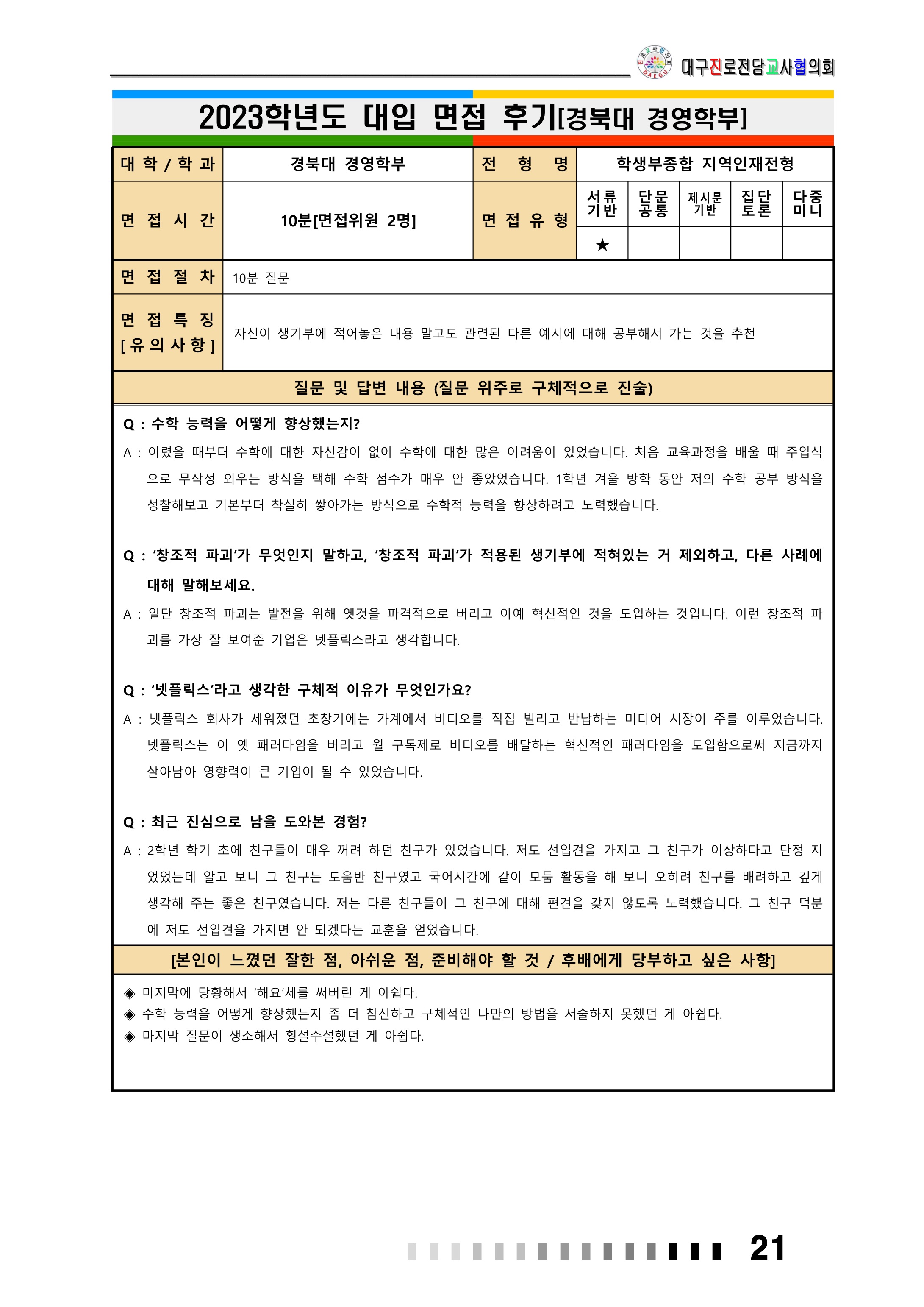 2023학년도 경북대학교 면접 후기6 - 경영학부 2023학년도 경북대학교 면접 후기7 - 경영학부