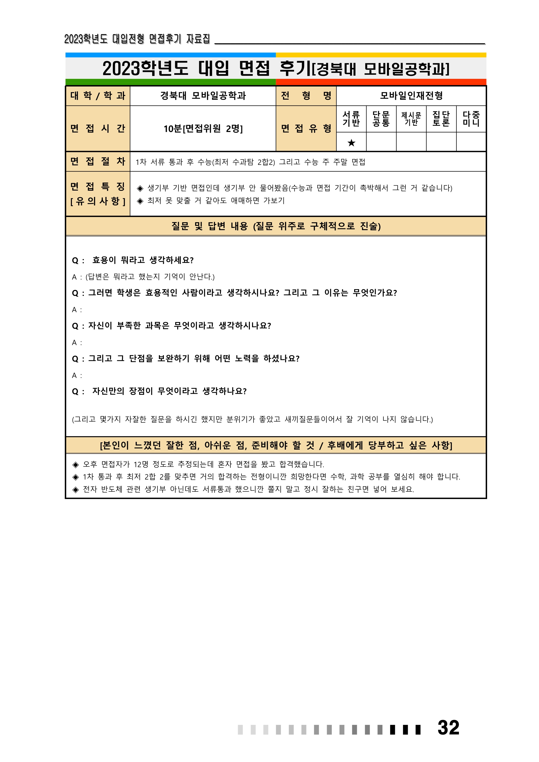 2023학년도 경북대학교 면접 후기14 - 모바일공학과 2023학년도 경북대학교 면접 후기15 - 모바일공학과