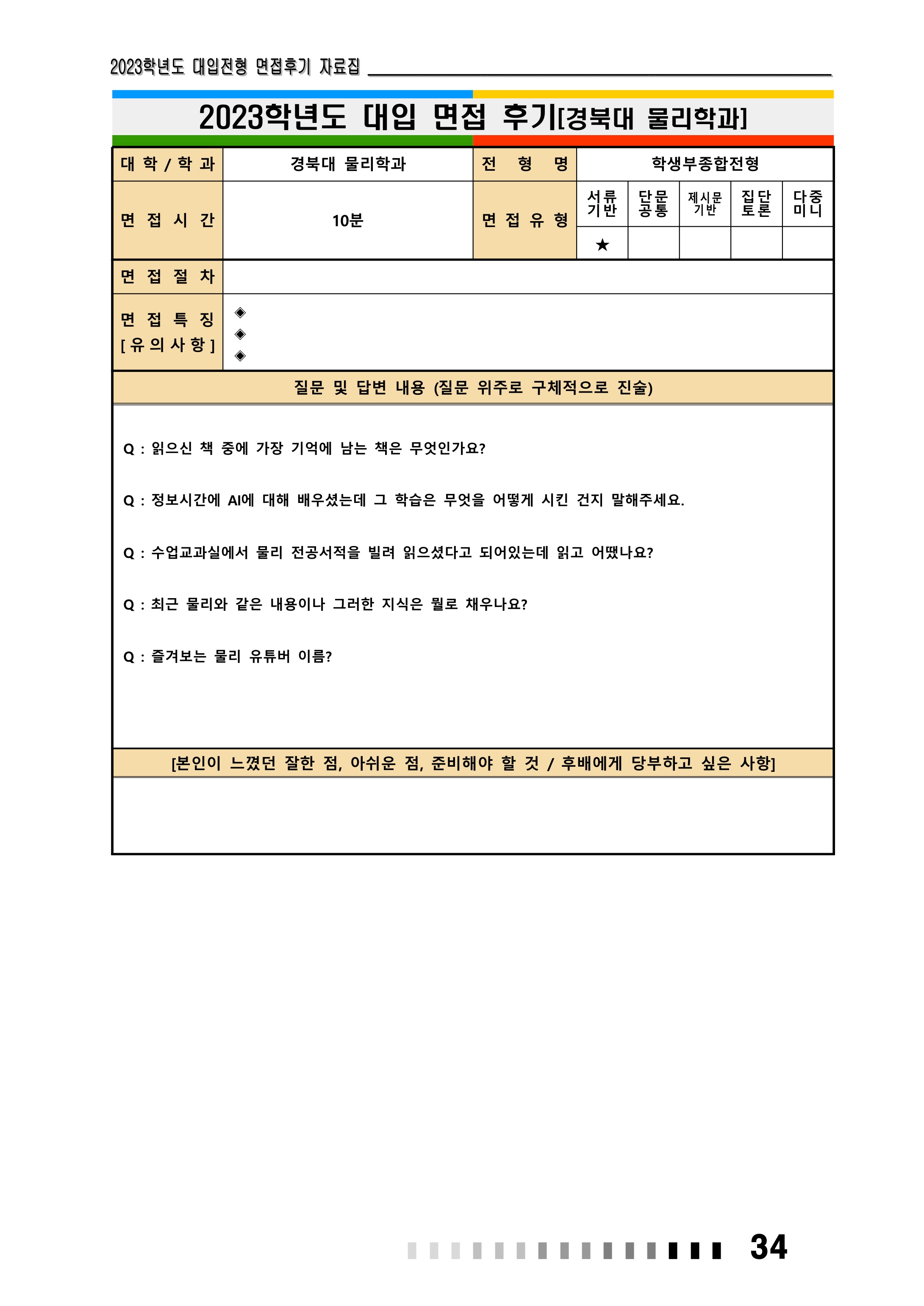 2023학년도 경북대학교 면접 후기15 - 모바일공학과 2023학년도 경북대학교 면접 후기16 - 물리학과