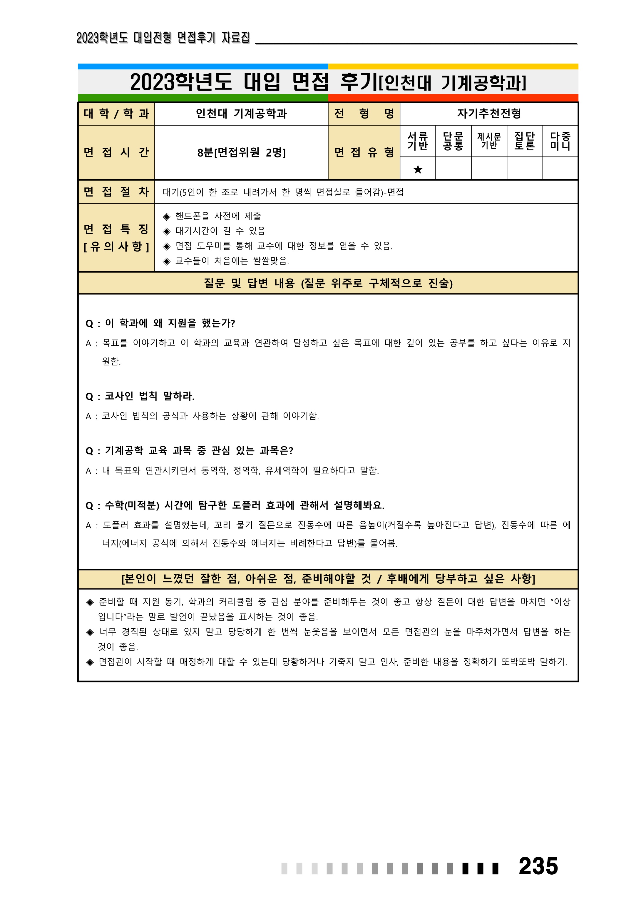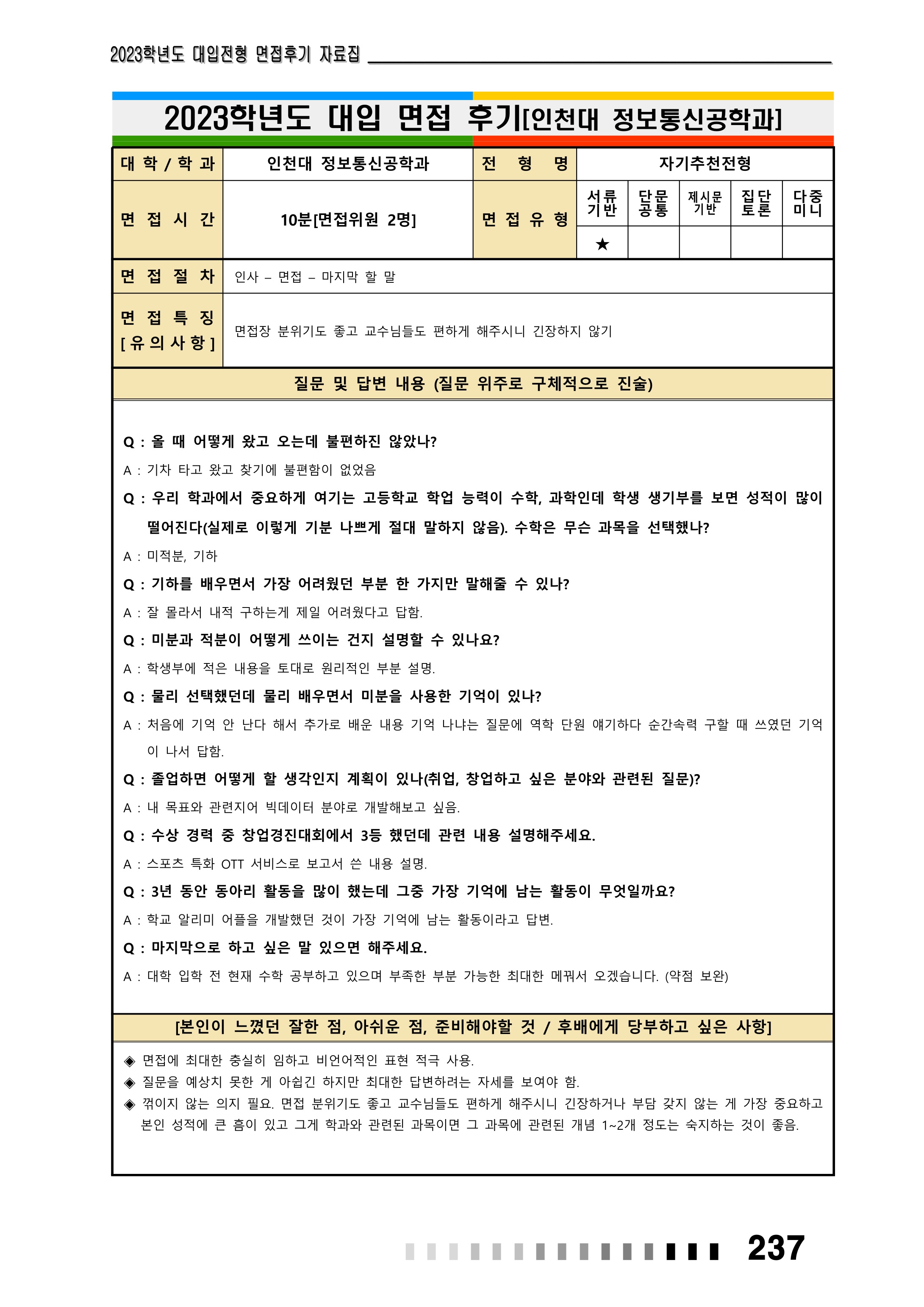 2023학년도 인천대학교 면접 후기5 - 신소재공학과 2023학년도 인천대학교 면접 후기6 - 정보통신공학과
