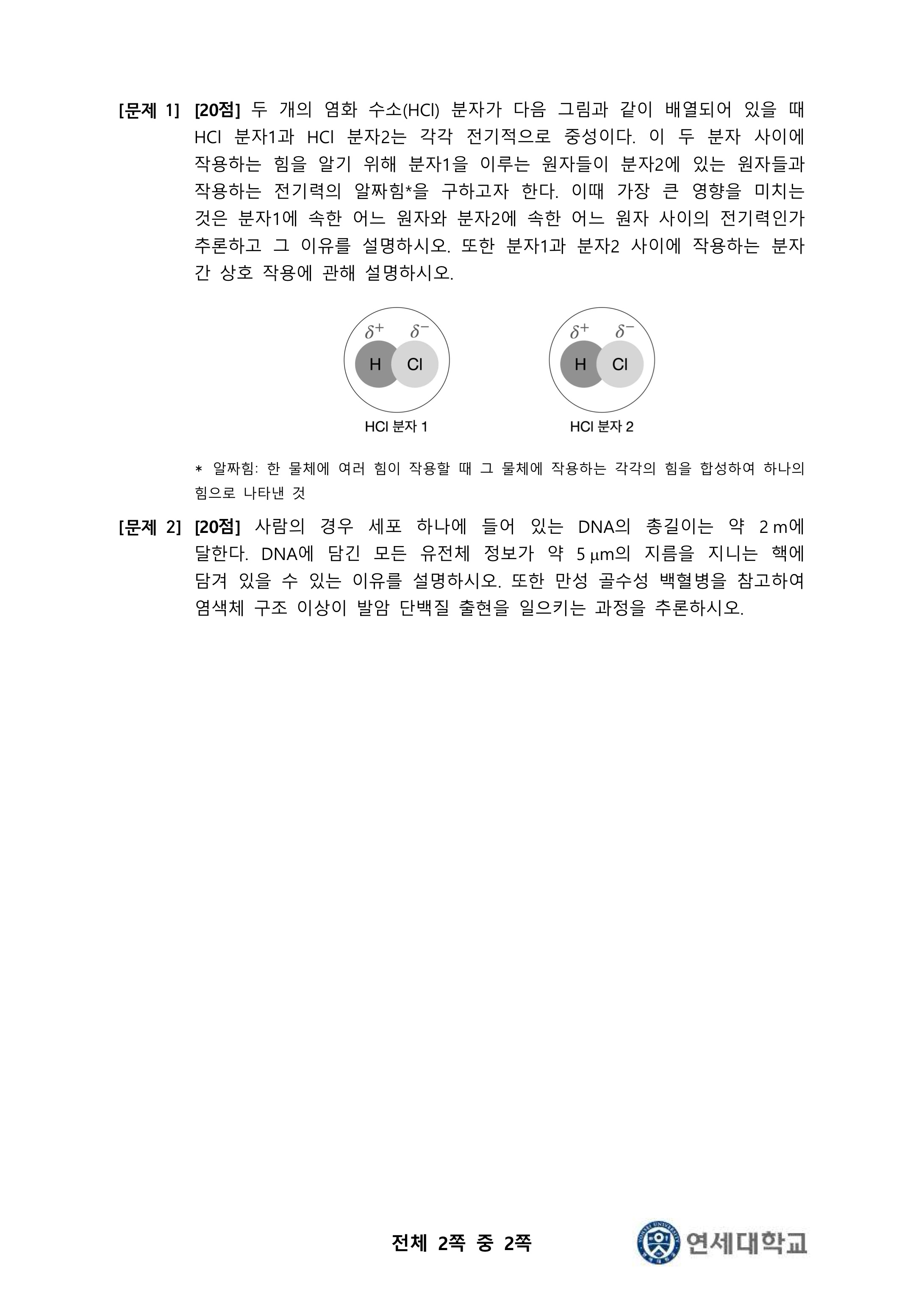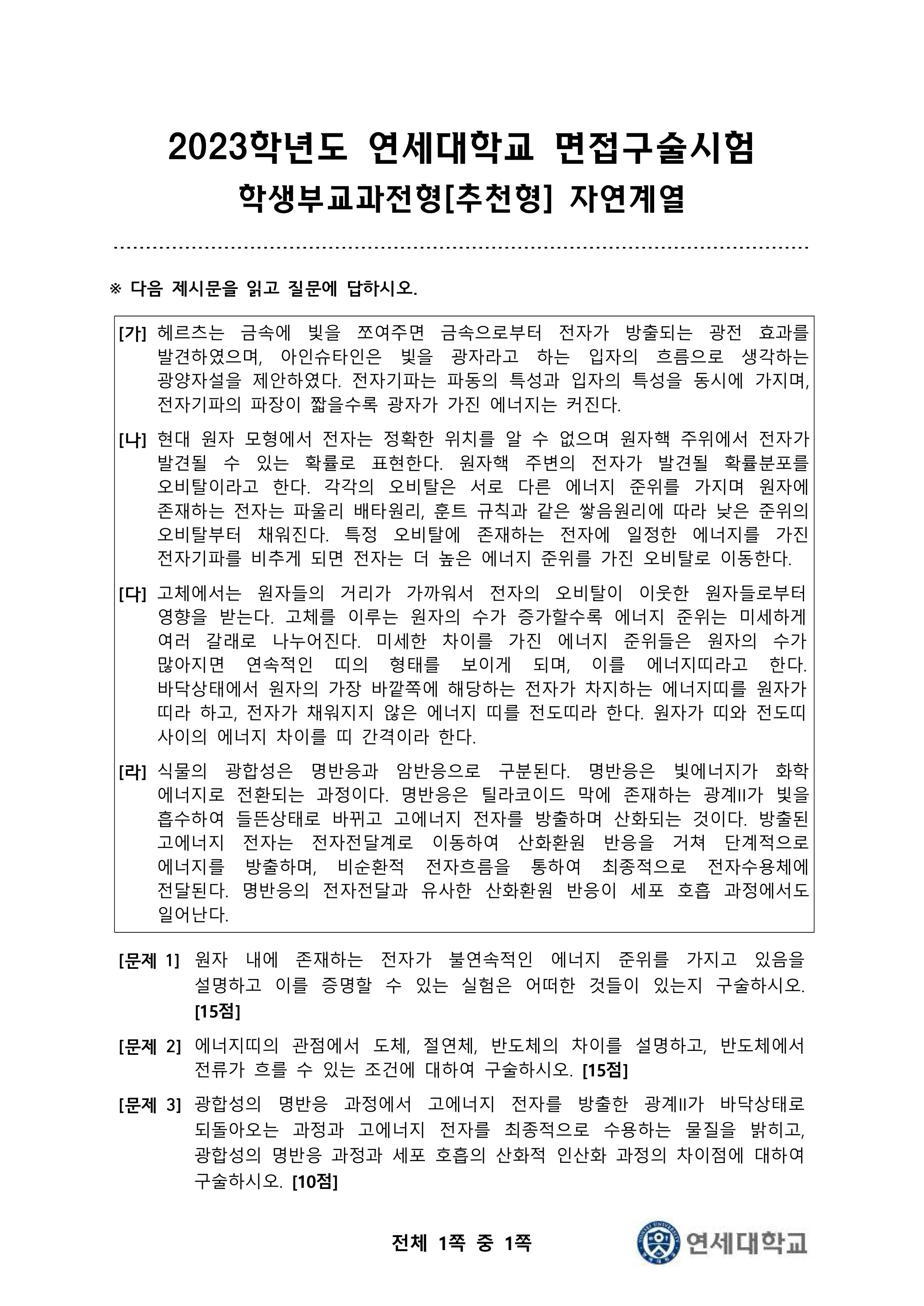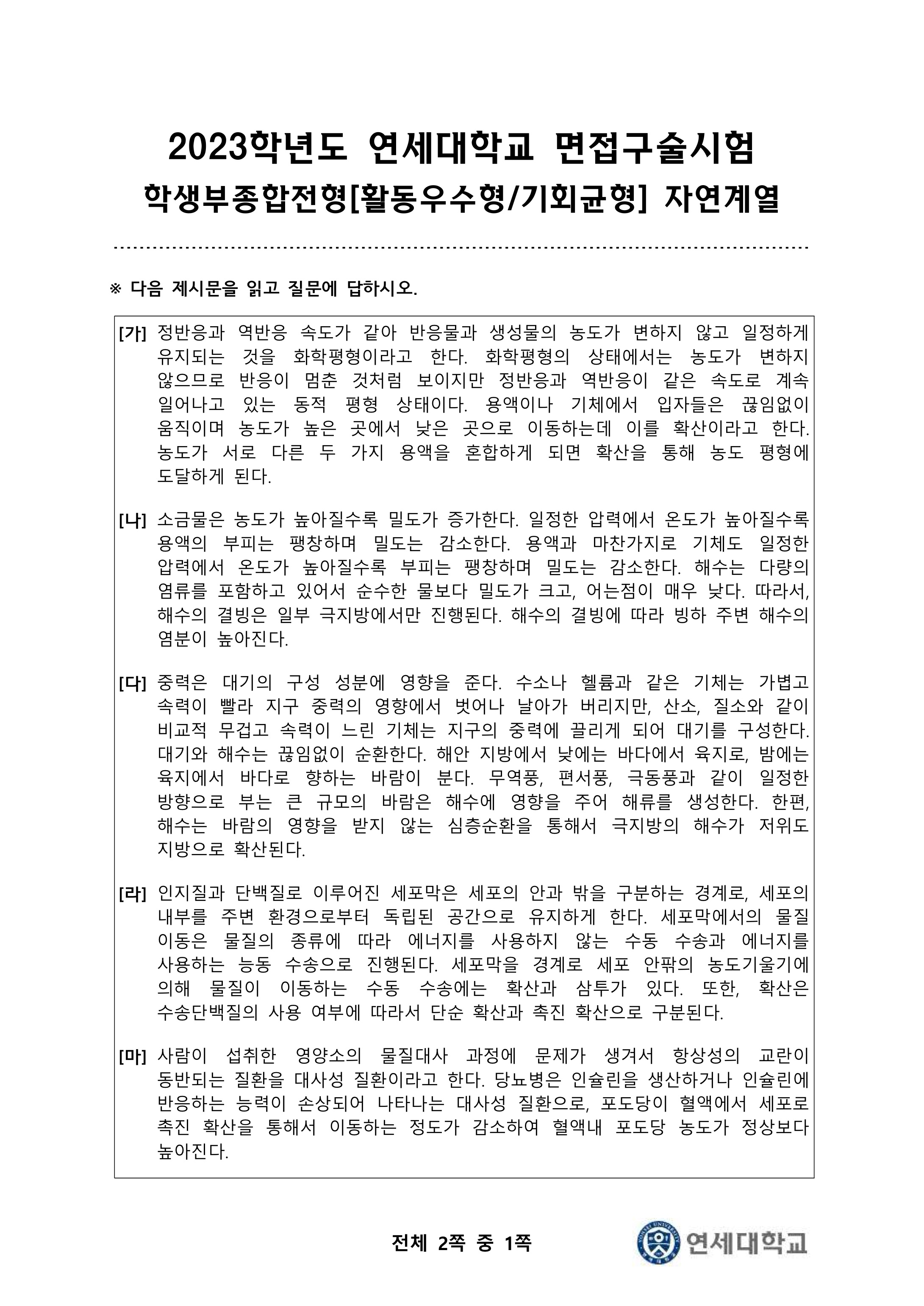 2023학년도 연세대학교 학생부교과전형[추천형] 자연계열 면접구술시험 문제 2023학년도 연세대학교 학생부교과전형[활동우수형/기회균형] 자연계열 면접구술시험 문제