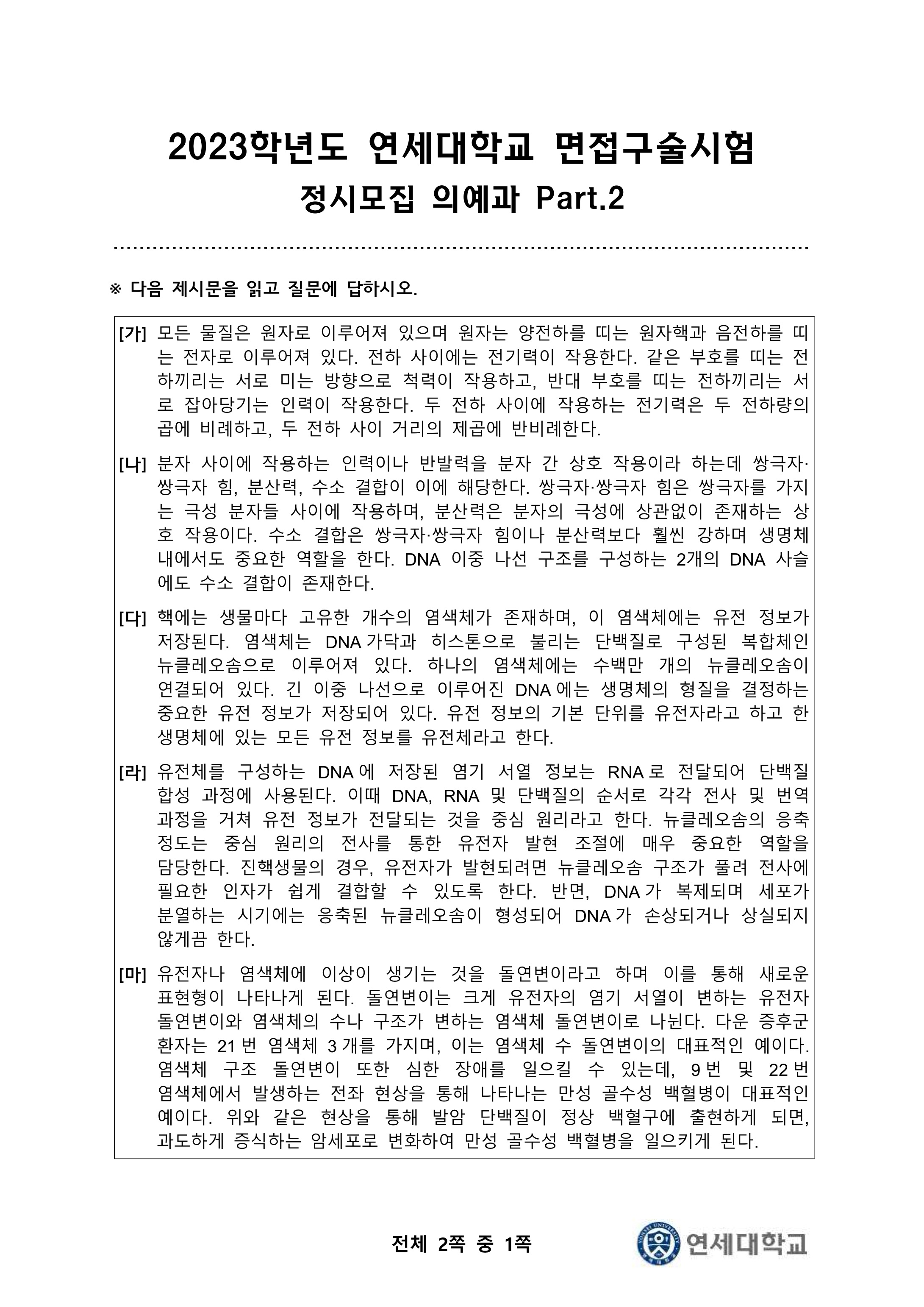2023학년도 연세대학교 정시모집 의예과 면접구술시험 문제 Part 1 2023학년도 연세대학교 정시모집 의예과 면접구술시험 문제 Part 2