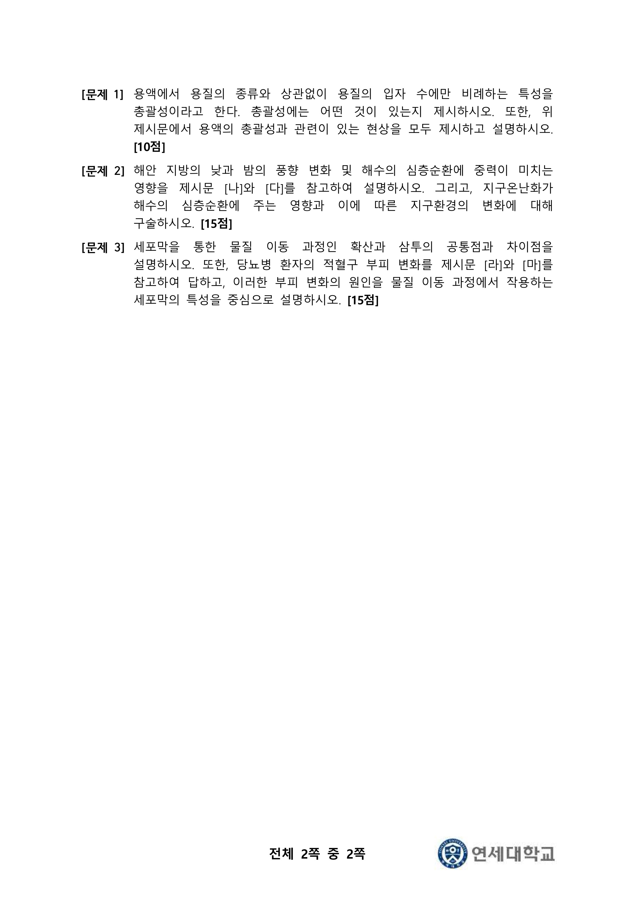 2023학년도 연세대학교 첨단융복합학과특별전형 면접구술시험 문제 2023학년도 연세대학교 특기자전형[국제인재] 언더우드학부(생명과학공학) 면접구술시험 문제
