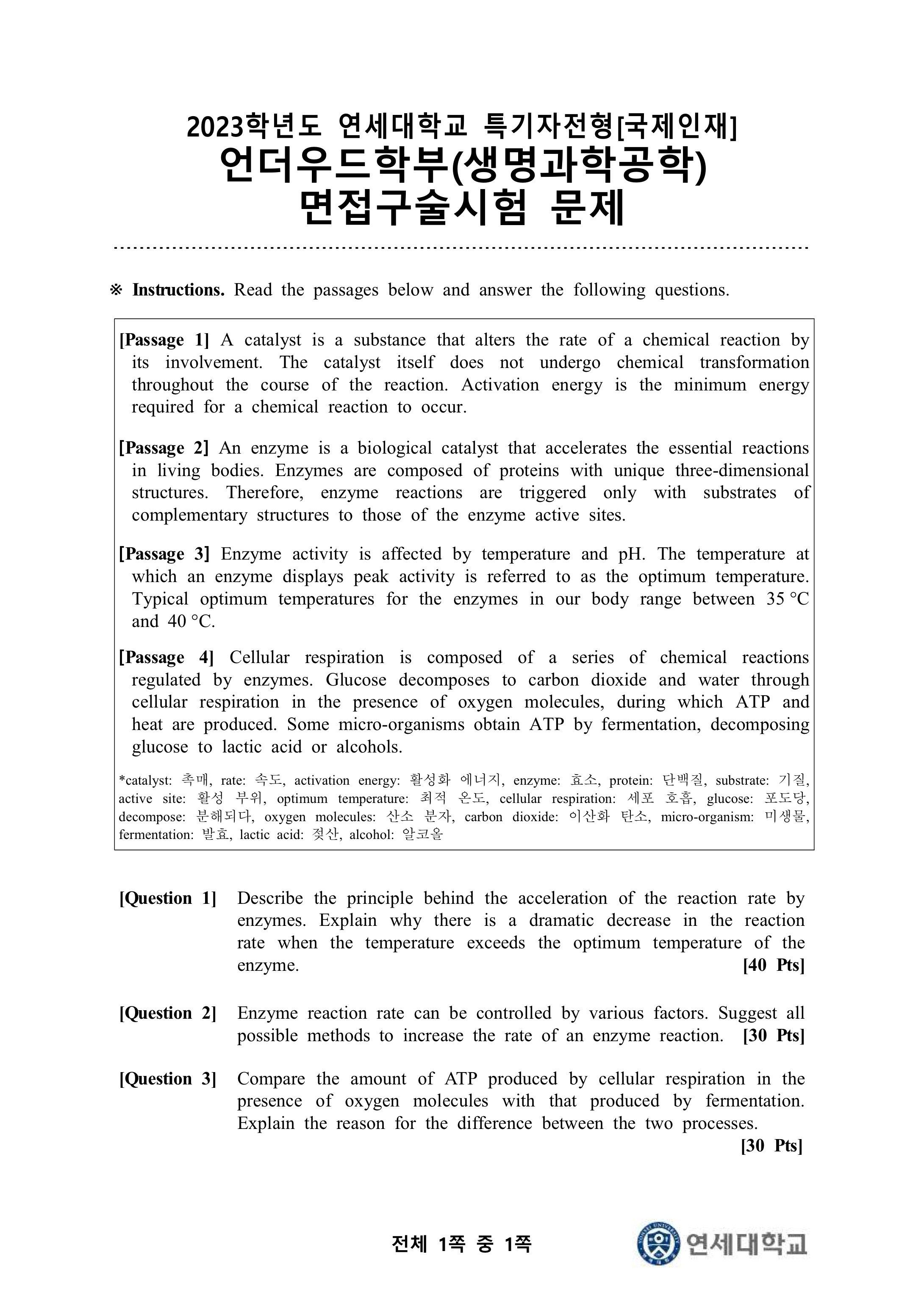 2023학년도 연세대학교 특기자전형[국제인재] 언더우드학부(생명과학공학) 면접구술시험 문제 2023학년도 연세대학교 정시모집 의예과 면접구술시험 문제 Part 1