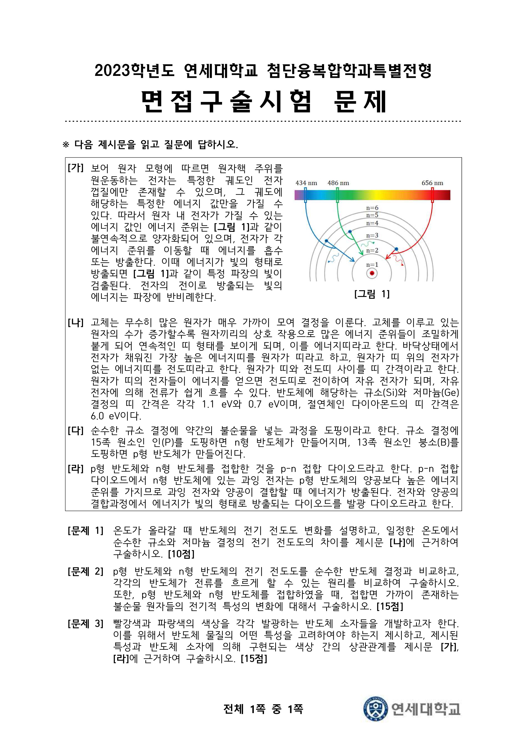 2023학년도 연세대학교 학생부교과전형[활동우수형/기회균형] 자연계열 면접구술시험 문제 2023학년도 연세대학교 첨단융복합학과특별전형 면접구술시험 문제