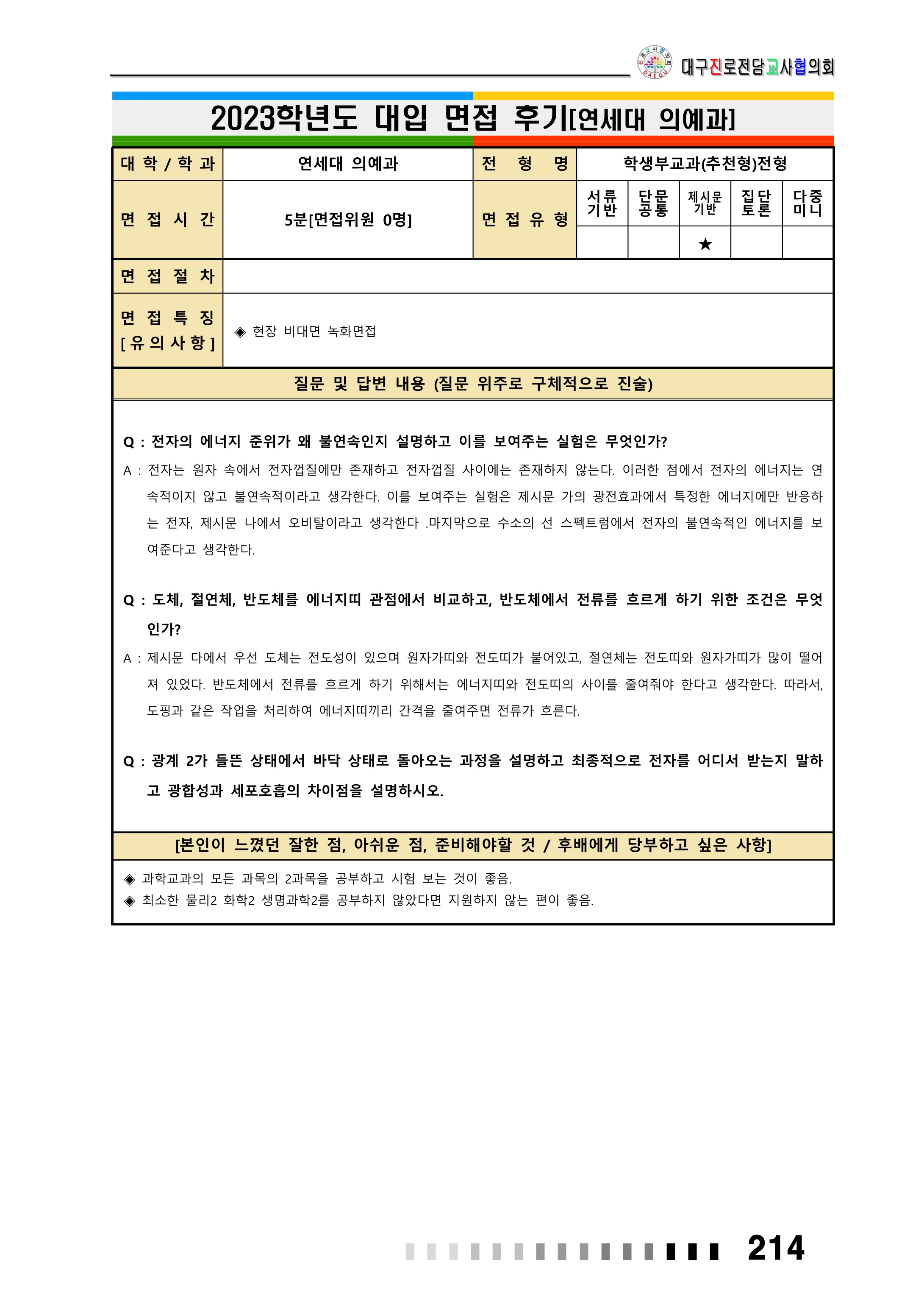 2023학년도 연세대학교 면접 후기5 - 사학과 2023학년도 연세대학교 면접 후기6 - 생명공학과