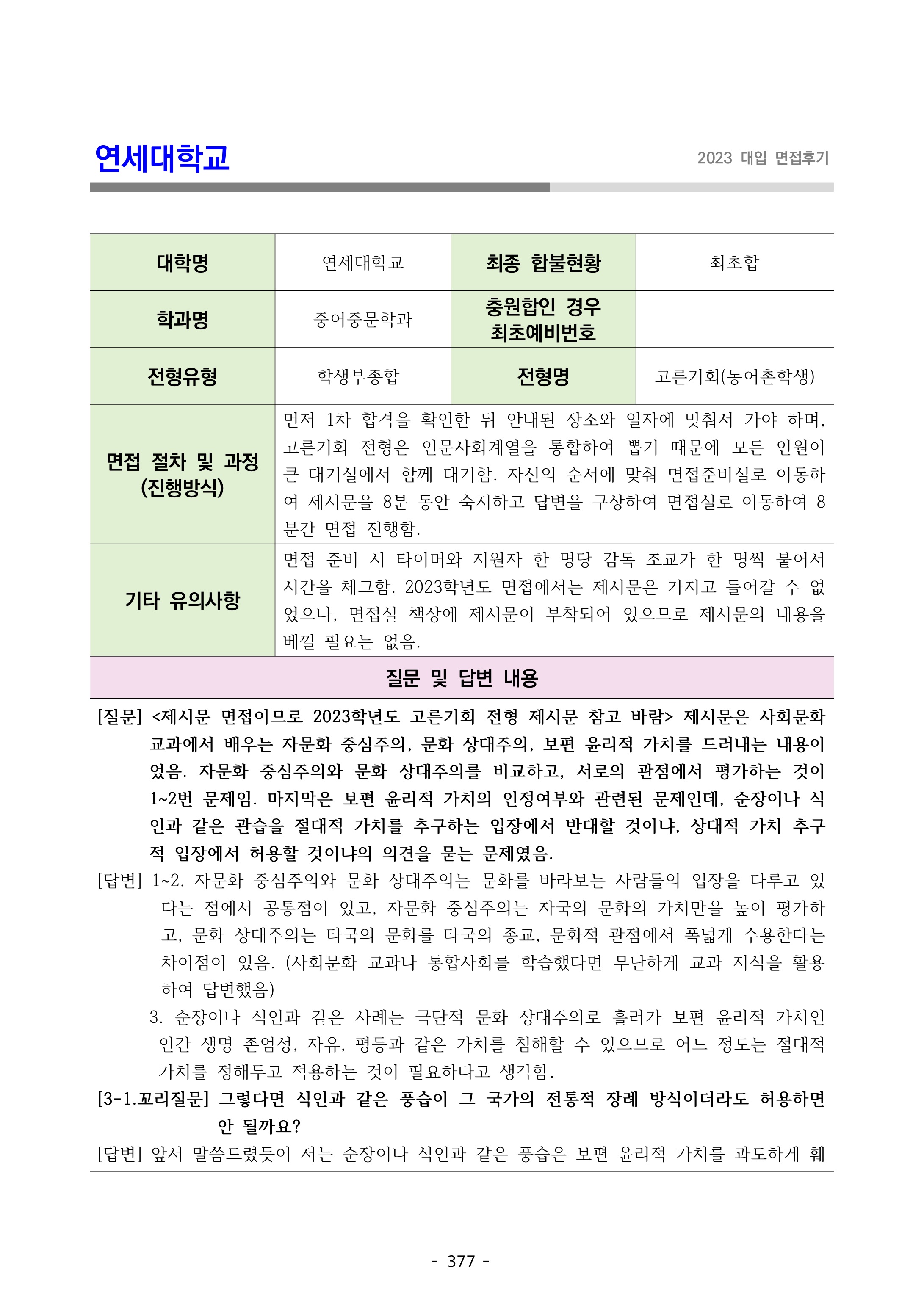 2023학년도 연세대학교 면접 후기14 - 중어중문학과