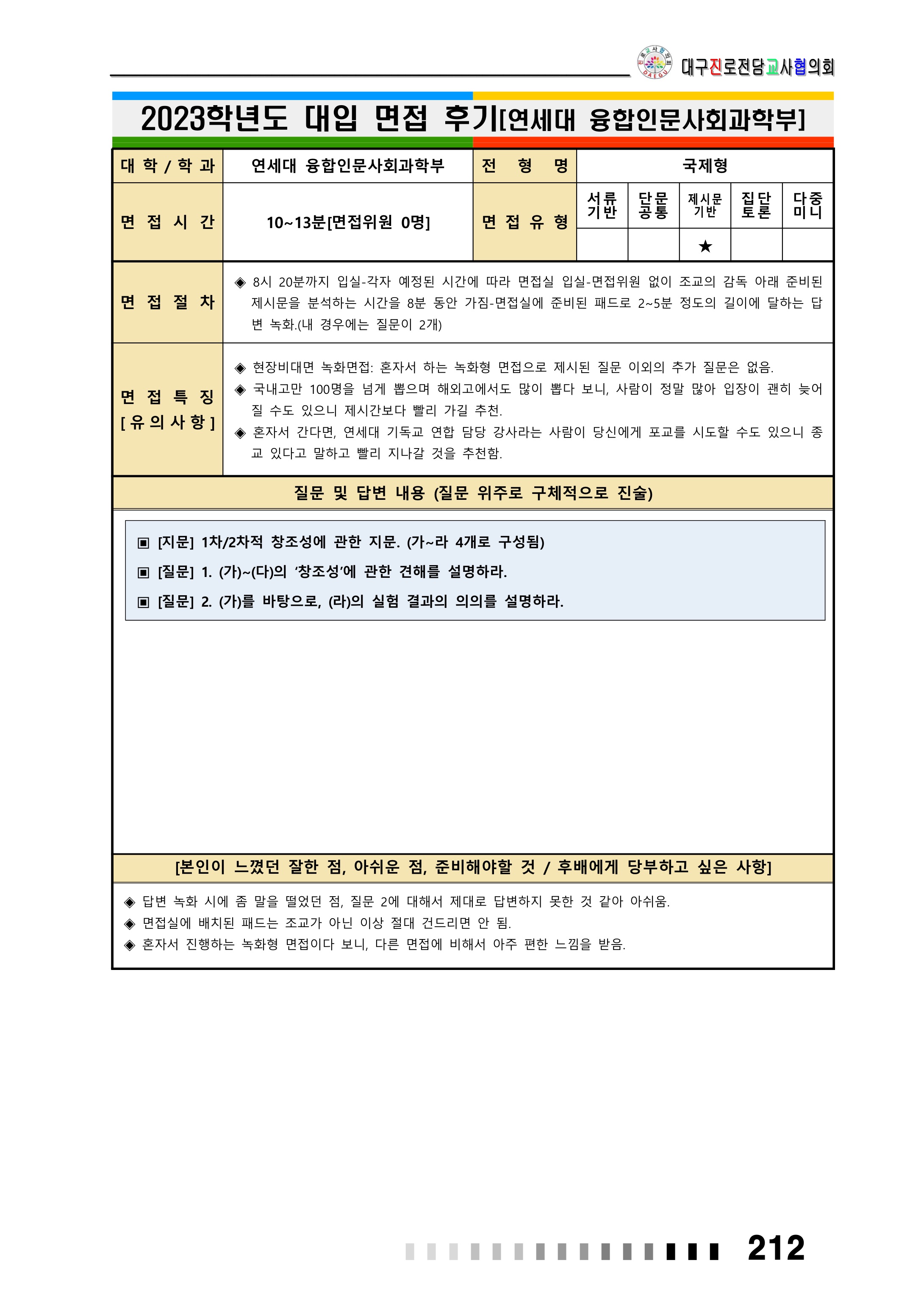 2023학년도 연세대학교 면접 후기10 - 융합인문사회과학부 2023학년도 연세대학교 면접 후기11 - 융합인문사회과학부