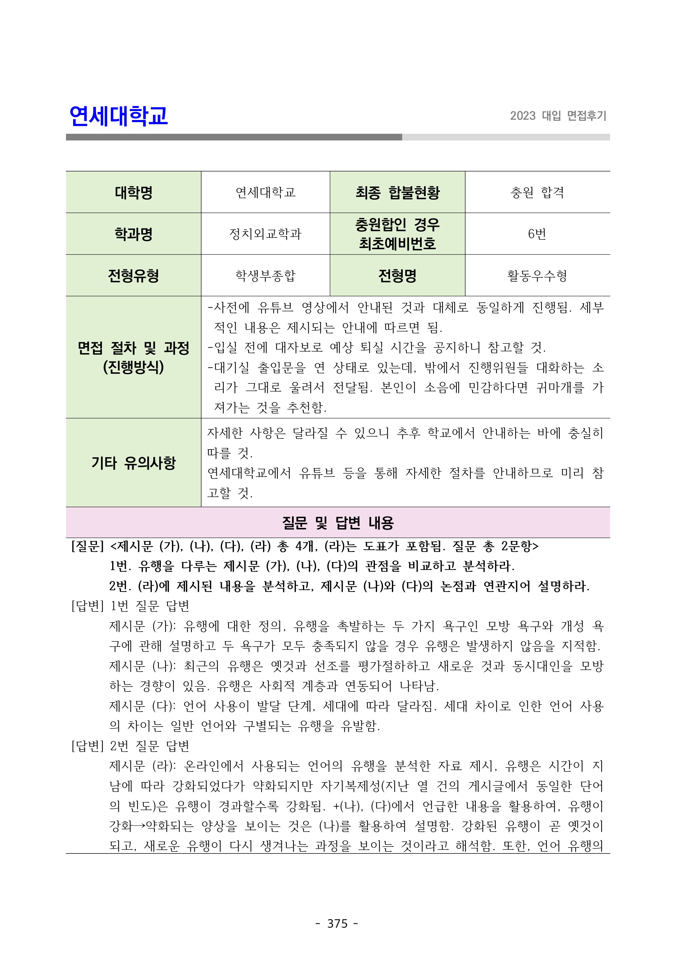 2023학년도 연세대학교 면접 후기13 - 정치외교학과