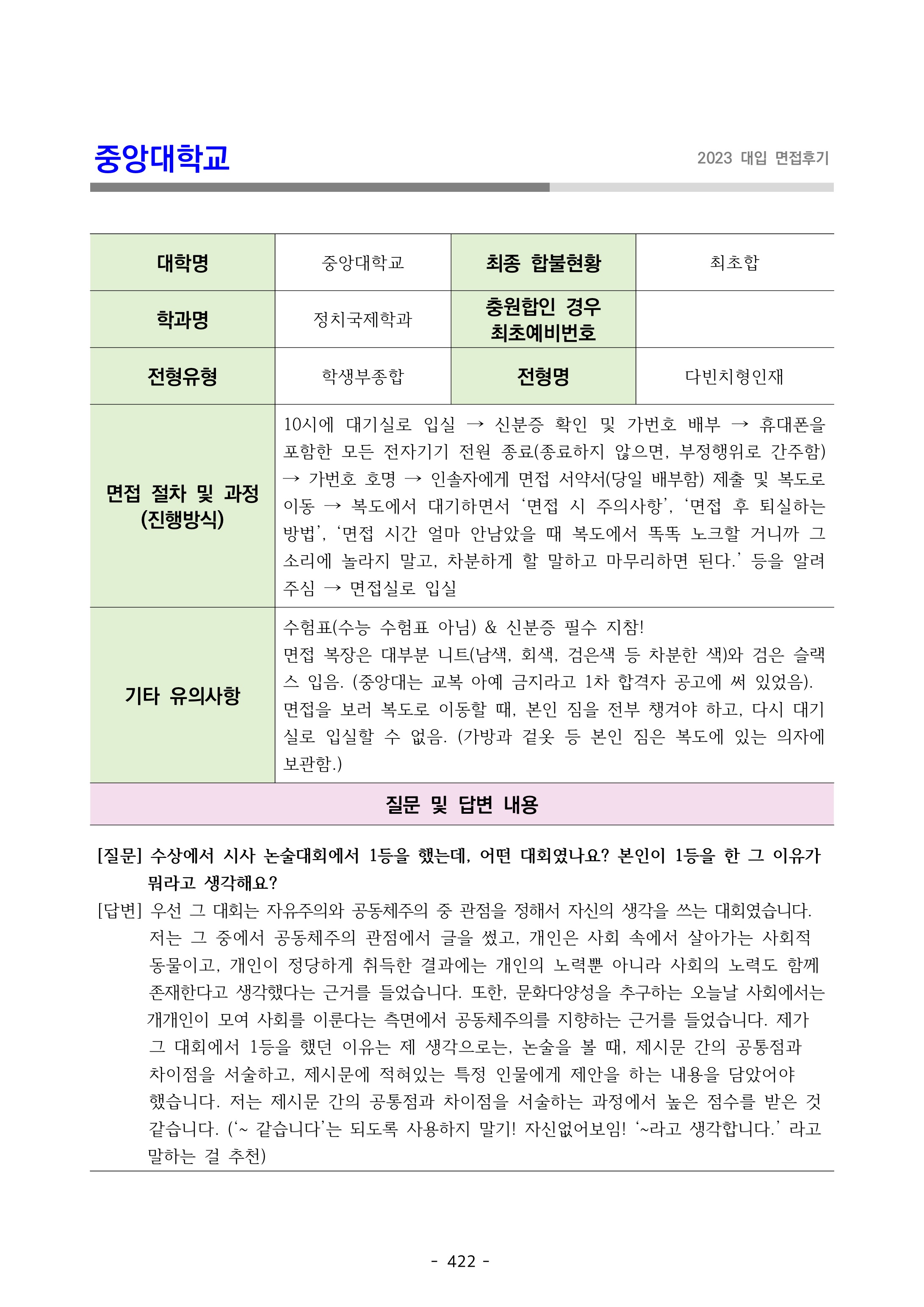 2023학년도 중앙대학교 면접 후기17 - 정치국제학과