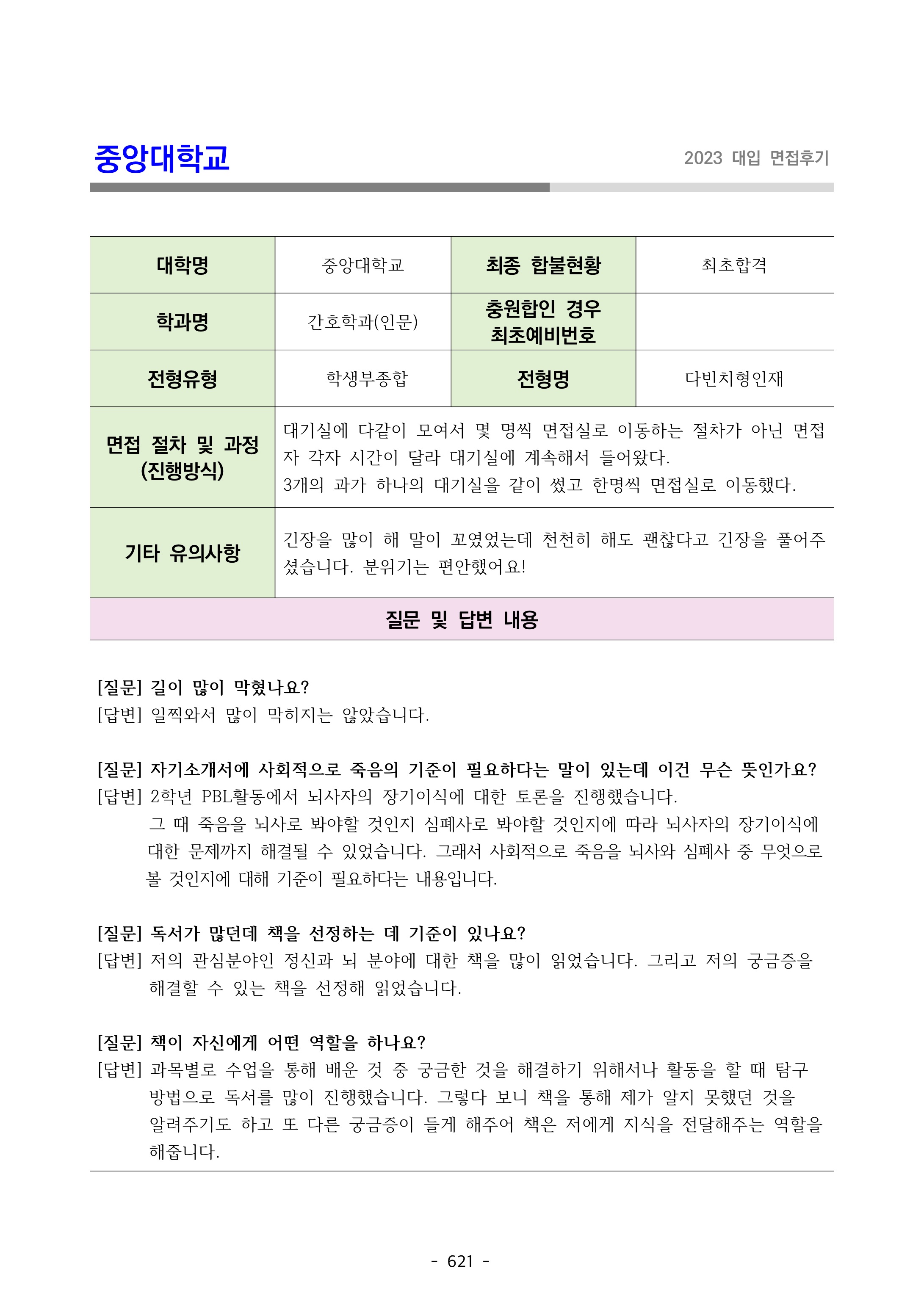 중앙대학교 화학신소재공학부2023학년도 중앙대학교 면접 후기1 - 간호학과