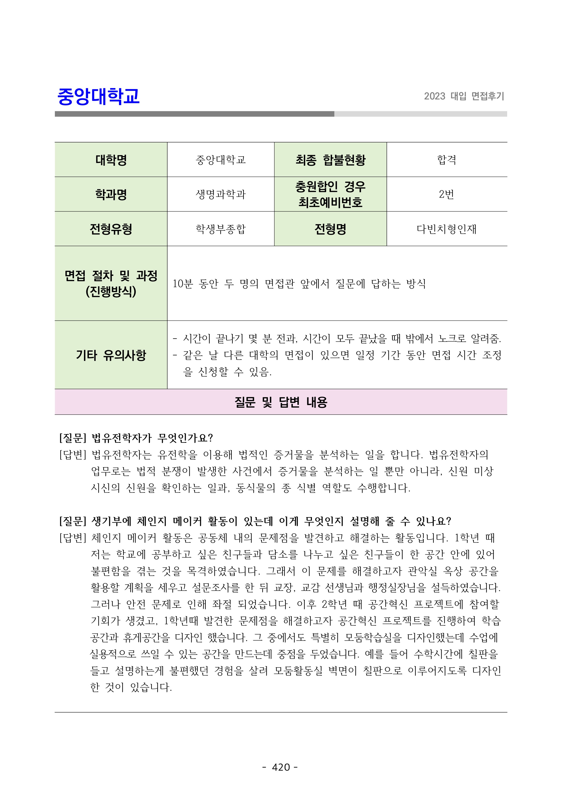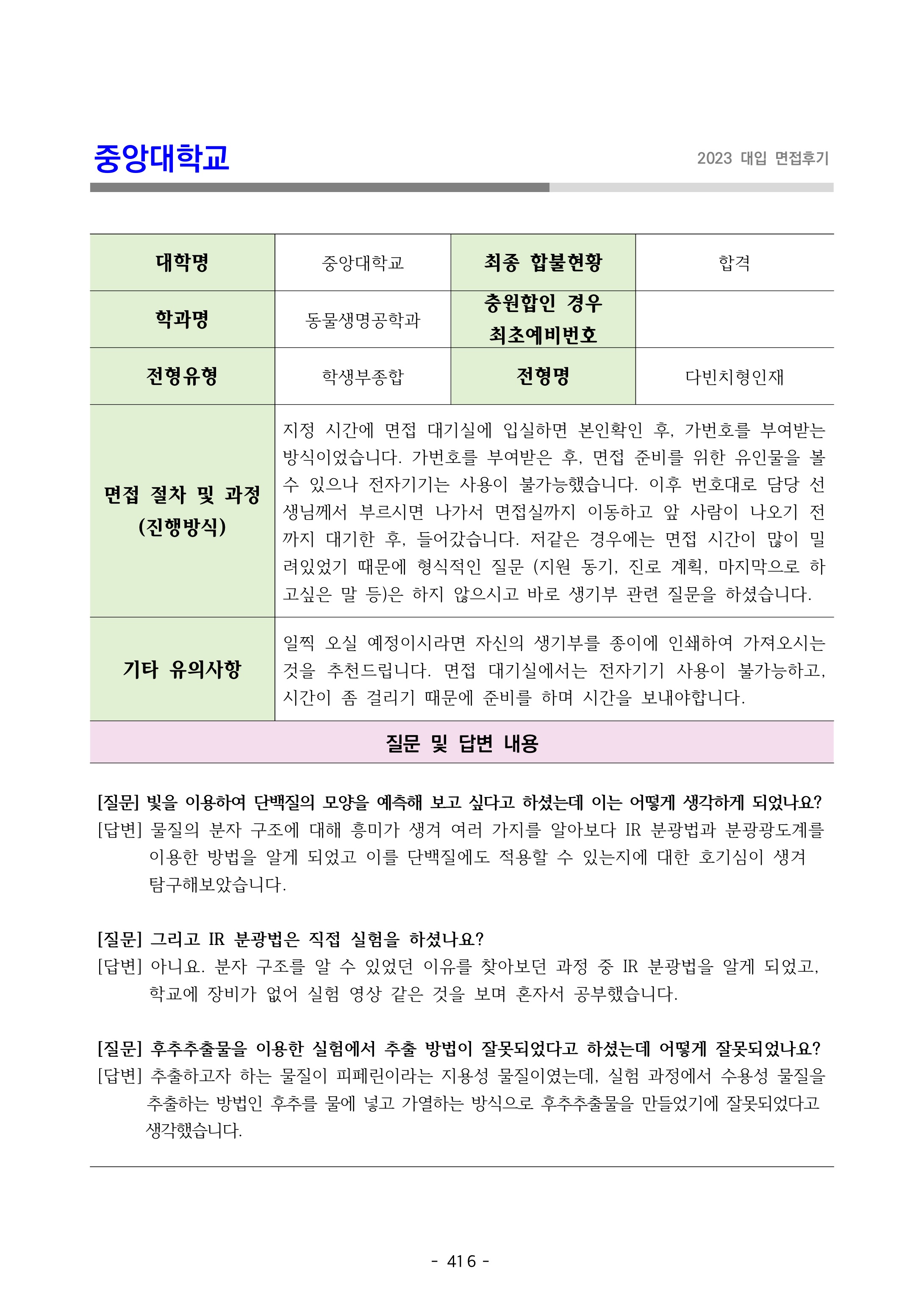 2023학년도 중앙대학교 면접 후기13 - 생명과학과
