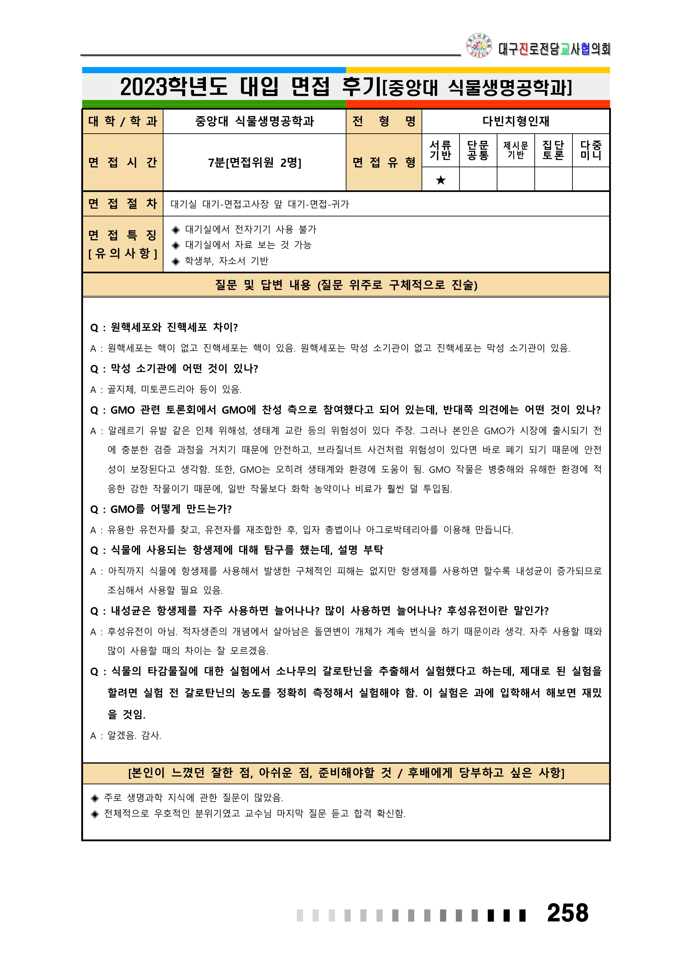 2023학년도 중앙대학교 면접 후기13 - 생명과학과 2023학년도 중앙대학교 면접 후기14 - 식물생명공학과