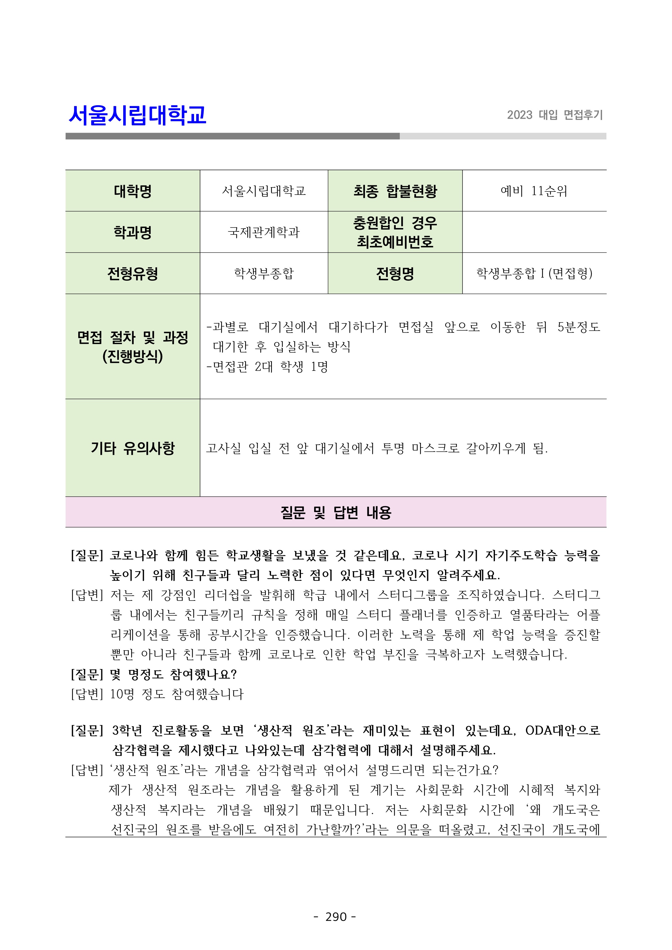 2023학년도 서울시립대학교 면접 후기6 - 국어국문학과 2023학년도 서울시립대학교 면접 후기7 - 국제관계학과