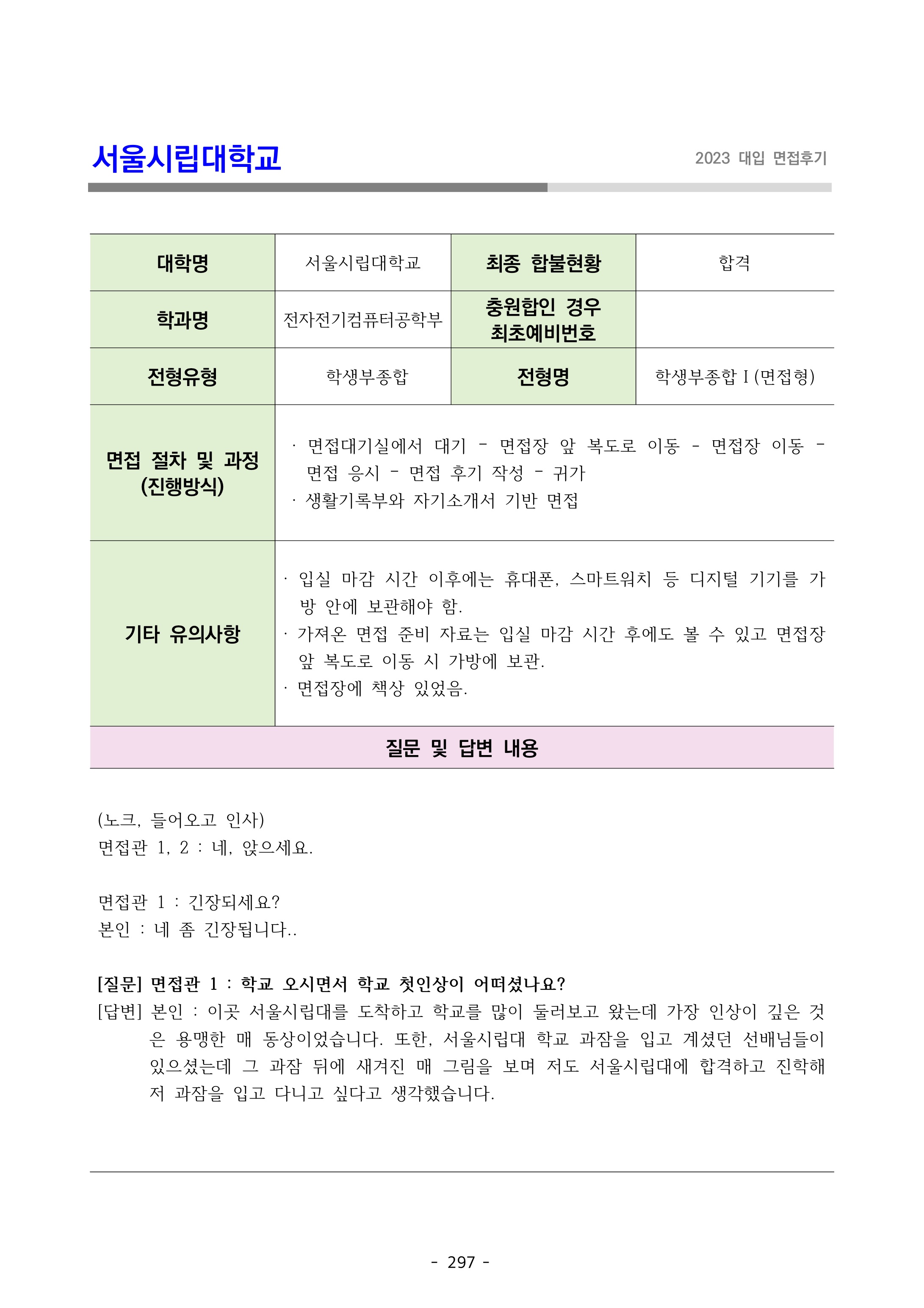 2023학년도 서울시립대학교 면접 후기16 - 전기전자컴퓨터공학부 2023학년도 서울시립대학교 면접 후기17 - 전기전자컴퓨터공학부