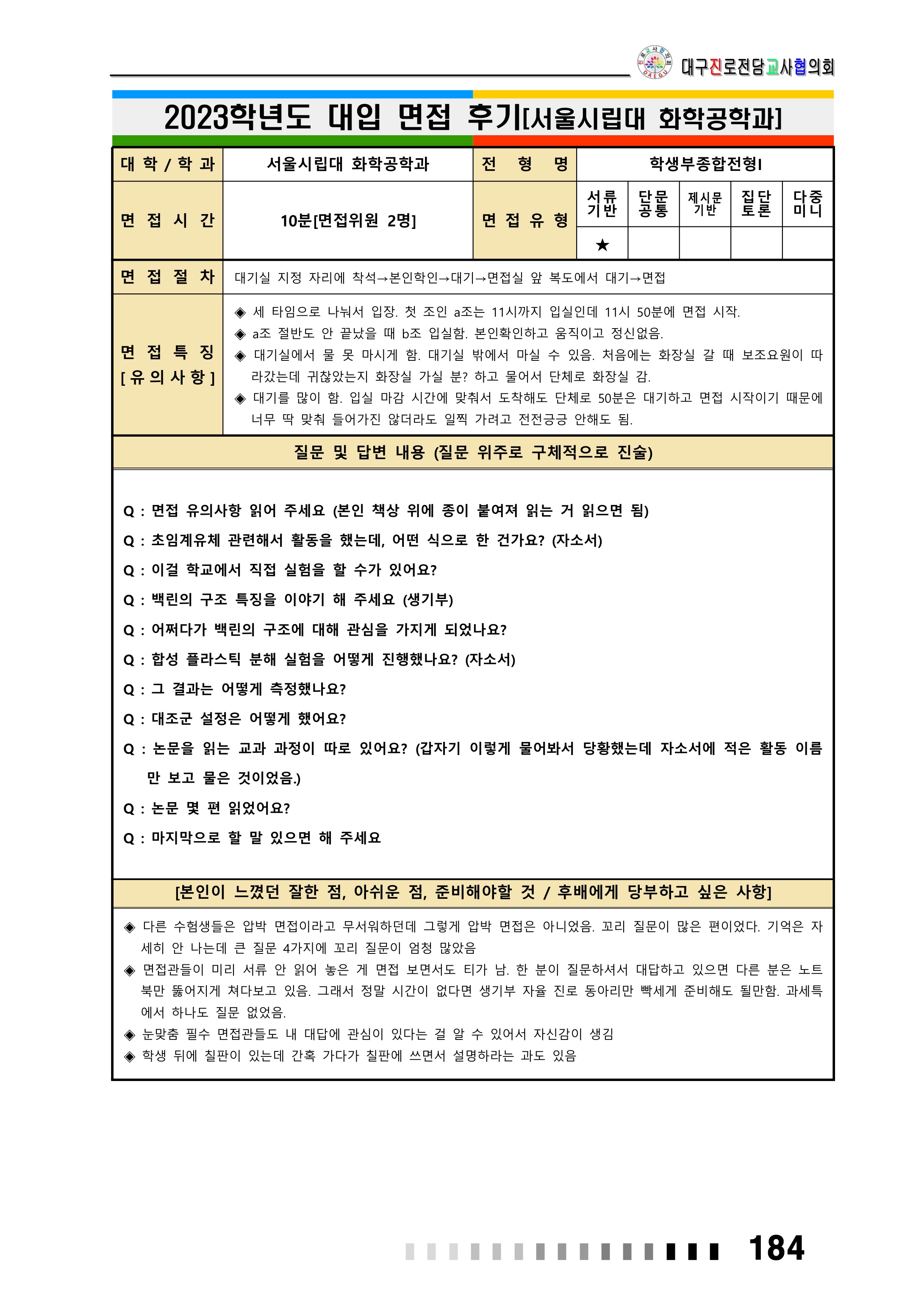 2023학년도 서울시립대학교 면접 후기22 - 행정학과 2023학년도 서울시립대학교 면접 후기23 - 화학공학과