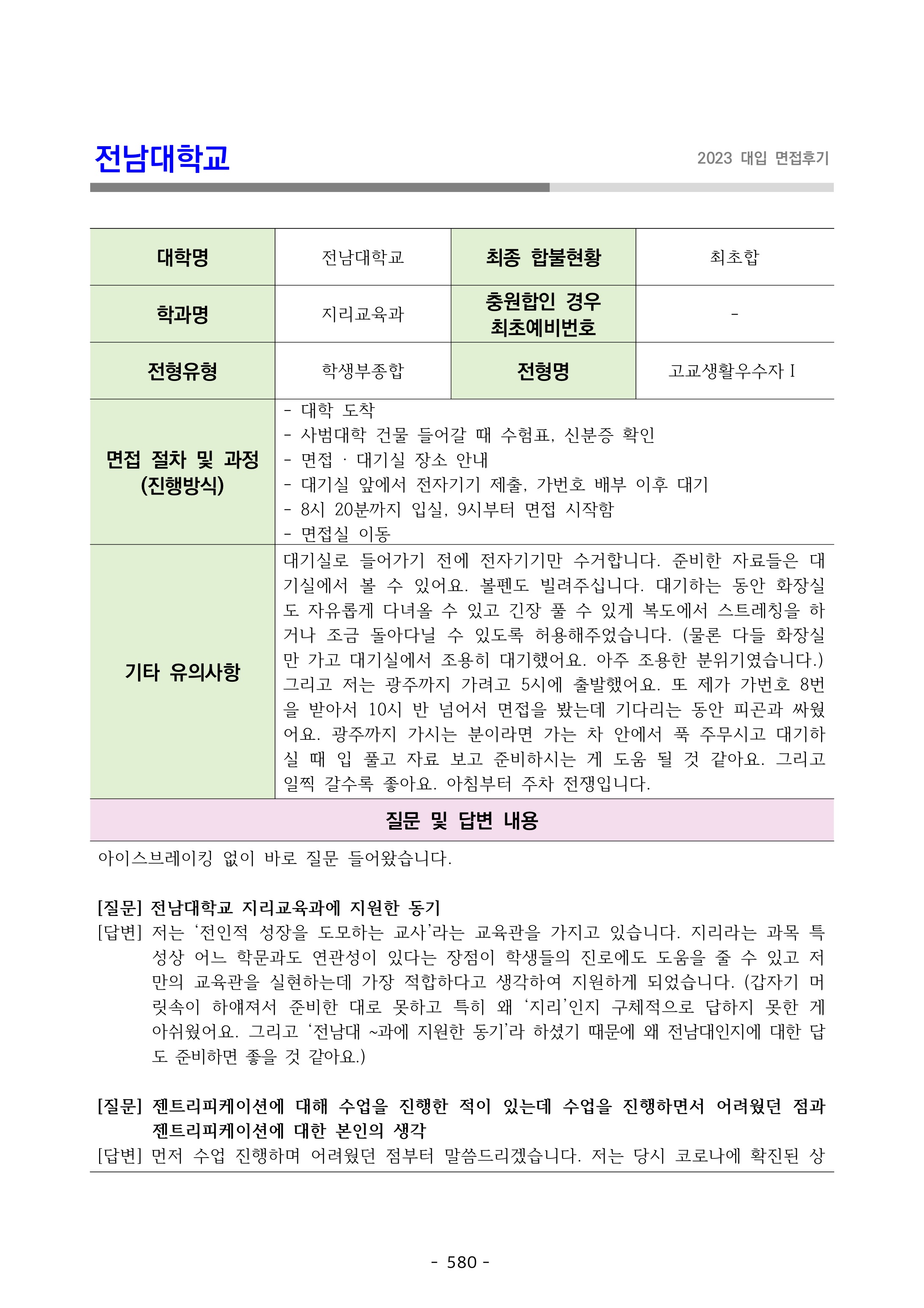 2023학년도 전남대학교 면접 후기1 - 지구과학교육과 2023학년도 전남대학교 면접 후기2 - 지리교육과