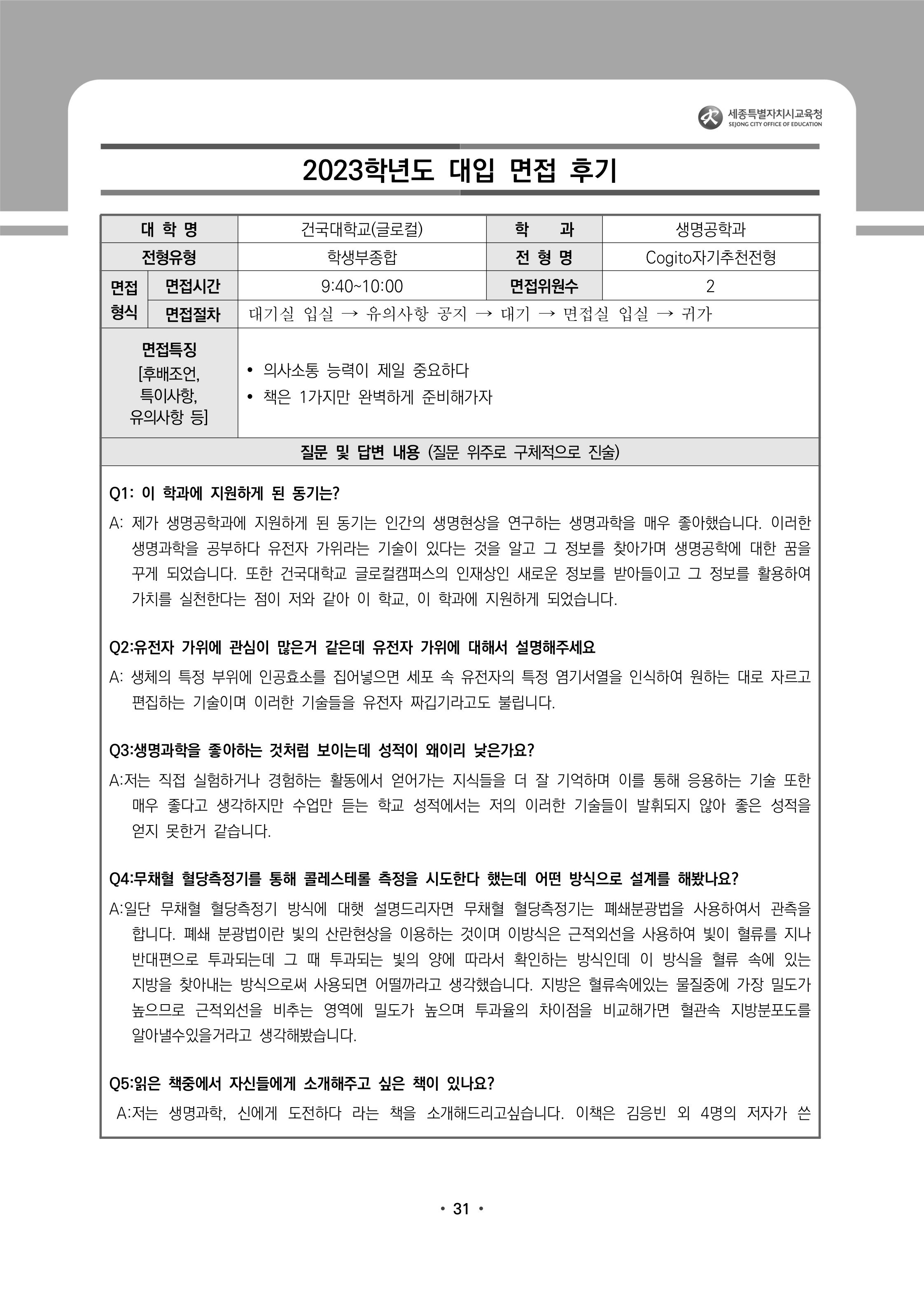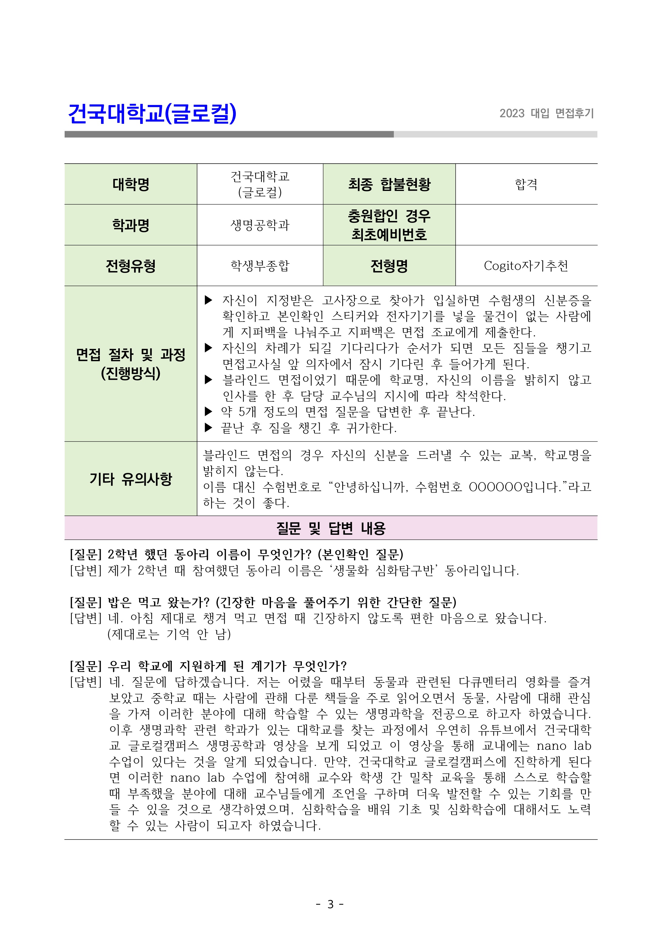 2023학년도 건국대학교 글로컬캠퍼스 면접 후기5 - 생명공학과