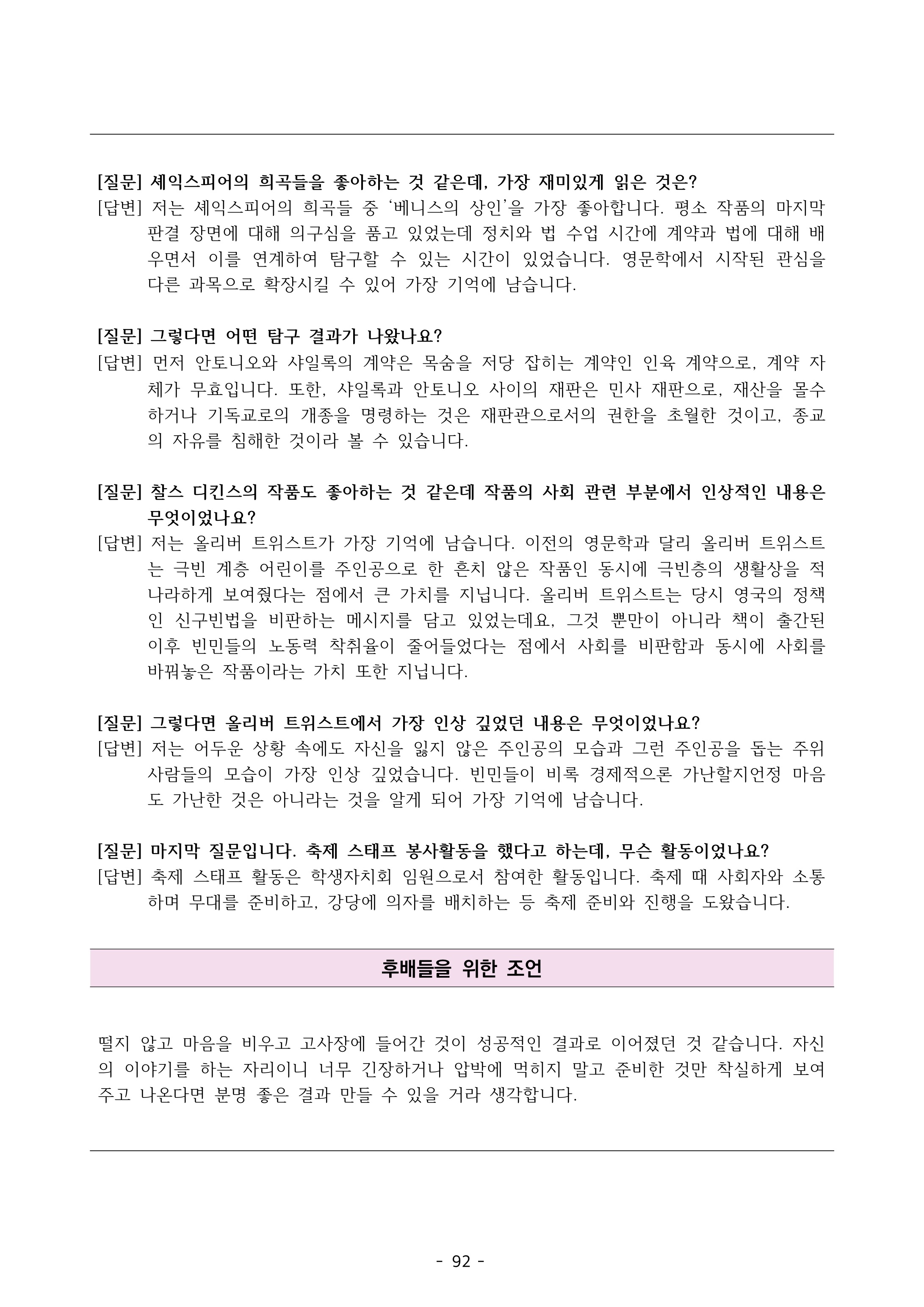 · 수업 시간에 질문이 많은 학생으로 작성되어 있는데, 질문을 많이 하게 된 이유는 무엇이며 특히 기억에 남는 질문이 있나요?2023학년도 가톨릭대학교 의예과 선발 인적성 면접 문항