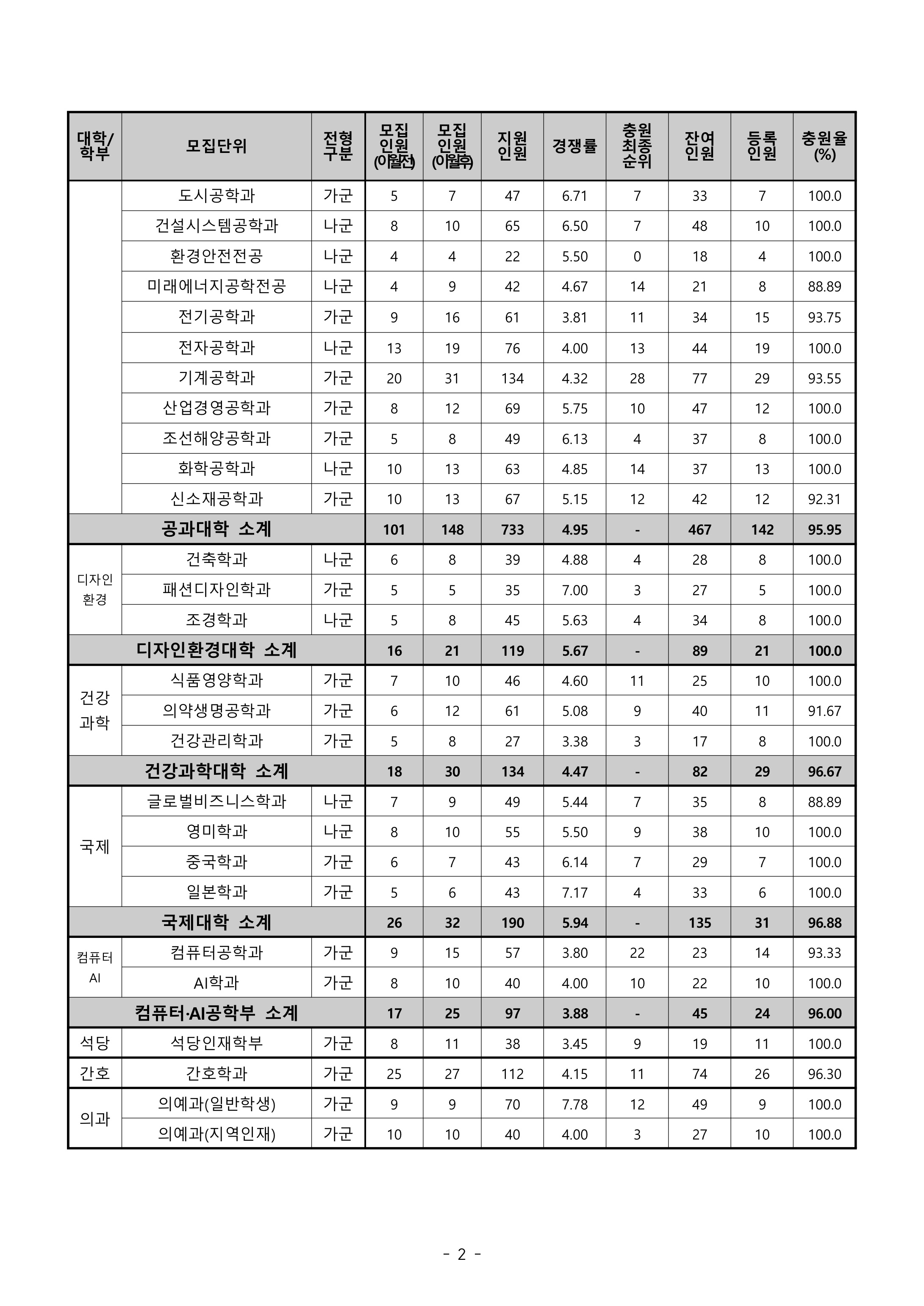 2023학년도 동아대학교 정시등급 구분 모집단위 모집