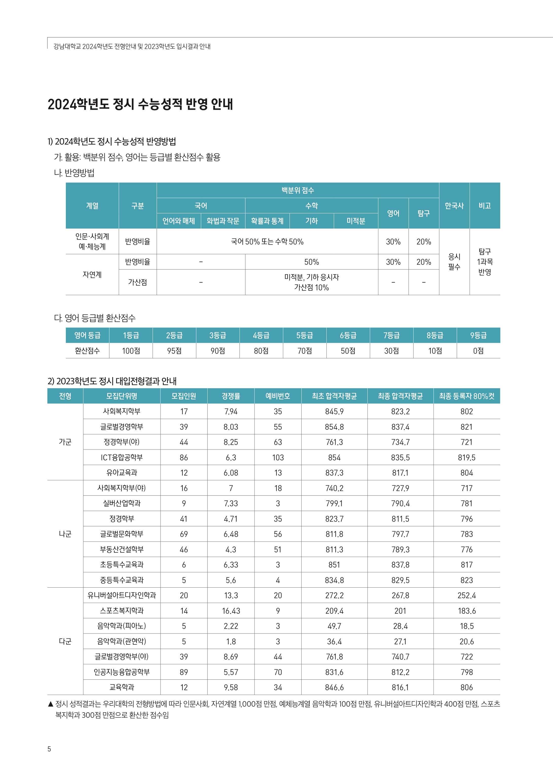2024학년도 강남대학교 정시모집 전형요약 및 주요 변경사항 2023학년도 강남대학교 정시등급